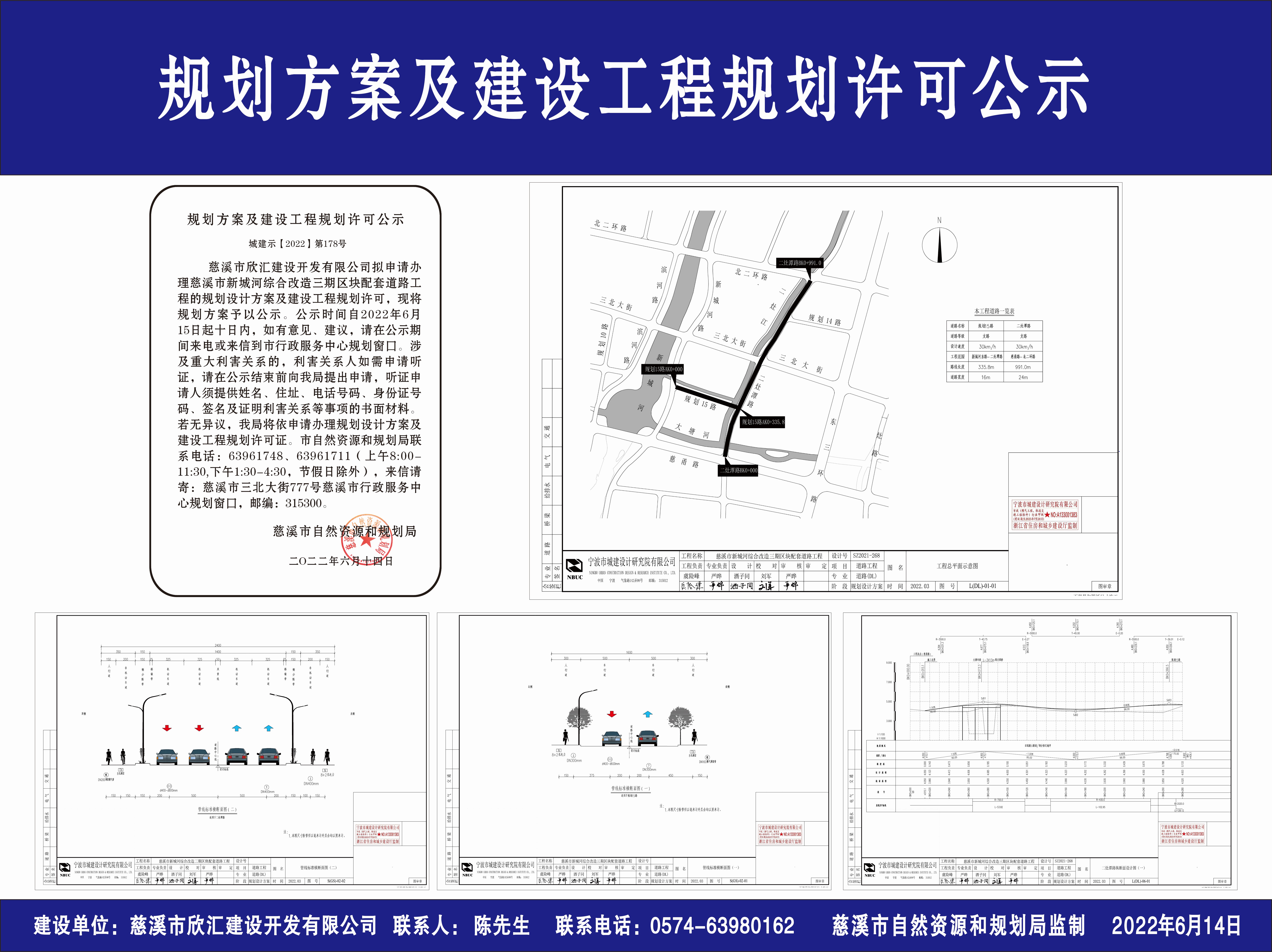 慈溪市欣汇建设开发有限公司拟申请办理慈溪市新城河综合改造三期区块配套道路工程的规划设计方案及建设工程规划许可,现将规划方案予以公示。公示时间自2022年6月15日起十日内,如有意见、建议,请在公示期间来电或来信到市行政服务中心规划窗口。涉及重大利害关系的,利害关系人如需申请听证,请在公示结束前向我局提出申请,听证申请人须提供姓名、住址、电话号码、身份证号码、签名及证明利害关系等事项的书面材料。若无异议,我局将依申请办理规划设计方案及建设工程规划许可证。市自然资源和规划局联系电话:63961748、63961711(上午8:00-11:30,下午1:30-4:30,节假日除外),来信请寄:慈溪市三北大街777号慈溪市行政服务中心规划窗口,邮编:315300。