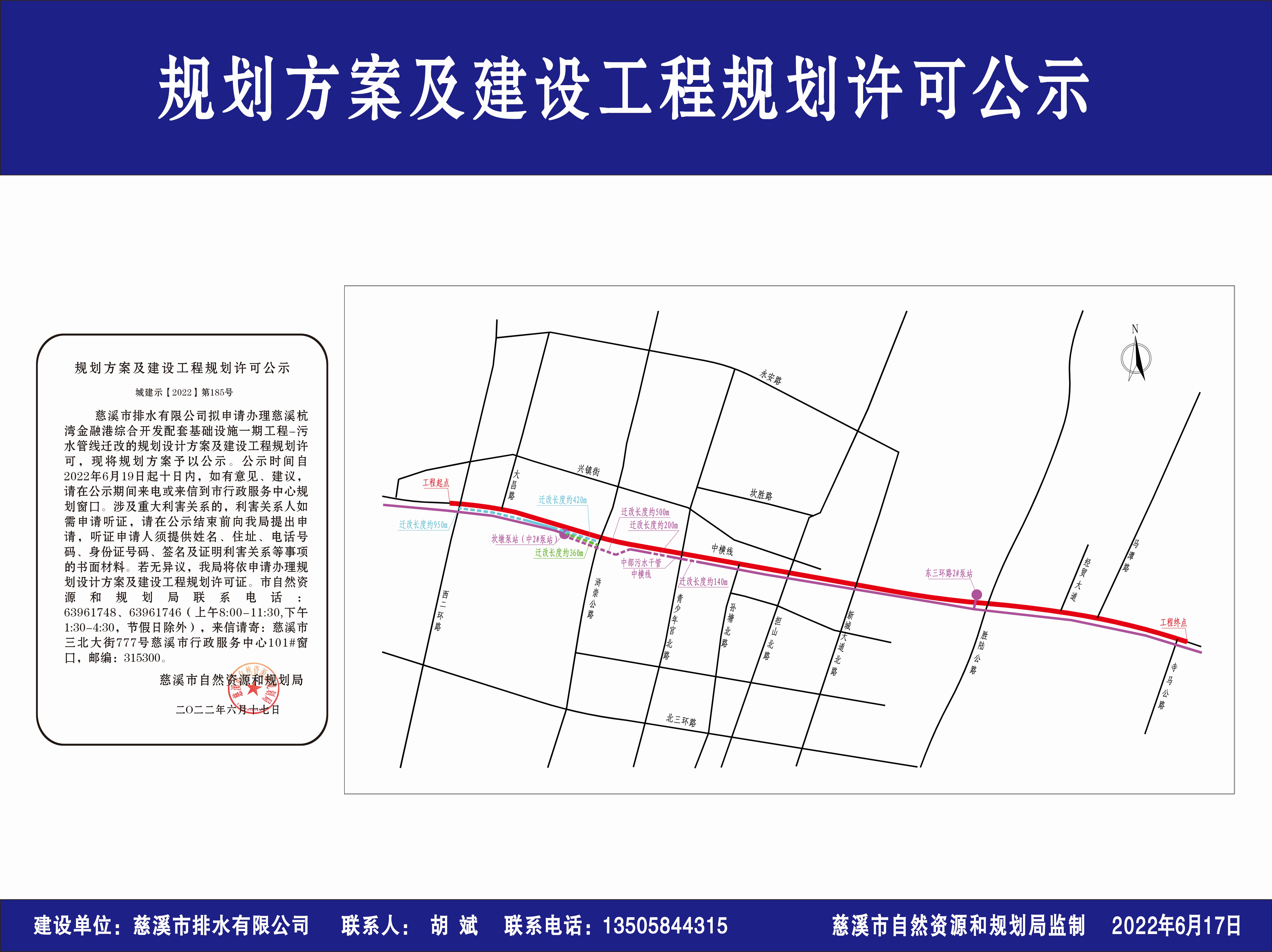慈溪市排水有限公司拟申请办理慈溪杭湾金融港综合开发配套基础设施一期工程-污水管线迁改的规划设计方案及建设工程规划许可,现将规划方案予以公示。公示时间自2022年6月19日起十日内,如有意见、建议,请在公示期间来电或来信到市行政服务中心规划窗口。涉及重大利害关系的,利害关系人如需申请听证,请在公示结束前向我局提出申请,听证申请人须提供姓名、住址、电话号码、身份证号码、签名及证明利害关系等事项的书面材料。若无异议,我局将依申请办理规划设计方案及建设工程规划许可证。市自然资源和规划局联系电话:63961748、63961746(上午8:00-11:30,下午1:30-4:30,节假日除外),来信请寄:慈溪市三北大街777号慈溪市行政服务中心101#窗口,邮编:315300。