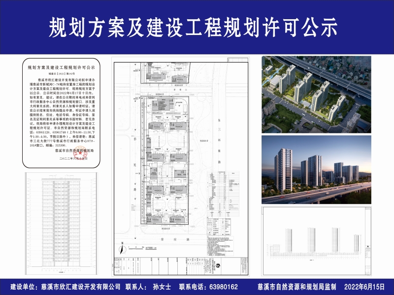 慈溪市欣汇建设开发有限公司拟申请办理慈溪市新城河C-7#地块安置房工程的规划设计方案及建设工程规划许可。现将规划方案予以公示。公示时间自2022年6月17日十日内,如有意见、建议,请在公示期间来电或来信到市行政服务中心自然资源和规划窗口。涉及重大利害关系的,利害关系人如需申请听证,请在公示结束前向我局提出申请,听证申请人须提供姓名、住址、电话号码、身份证号码、签名及证明利害关系等事项的书面材料。若无异议,我局将依申请办理规划设计方案及建设工程规划许可证。市自然资源和规划局联系电话:63961126、63961748(上午8:00-11:30,下午1:30-4:30,节假日除外),来信请寄:慈溪市三北大街777号慈溪市行政服务中心97#-101#窗口,邮编:315300。