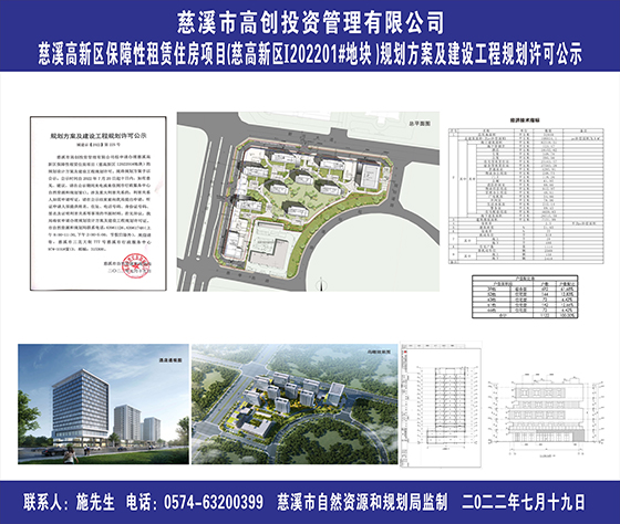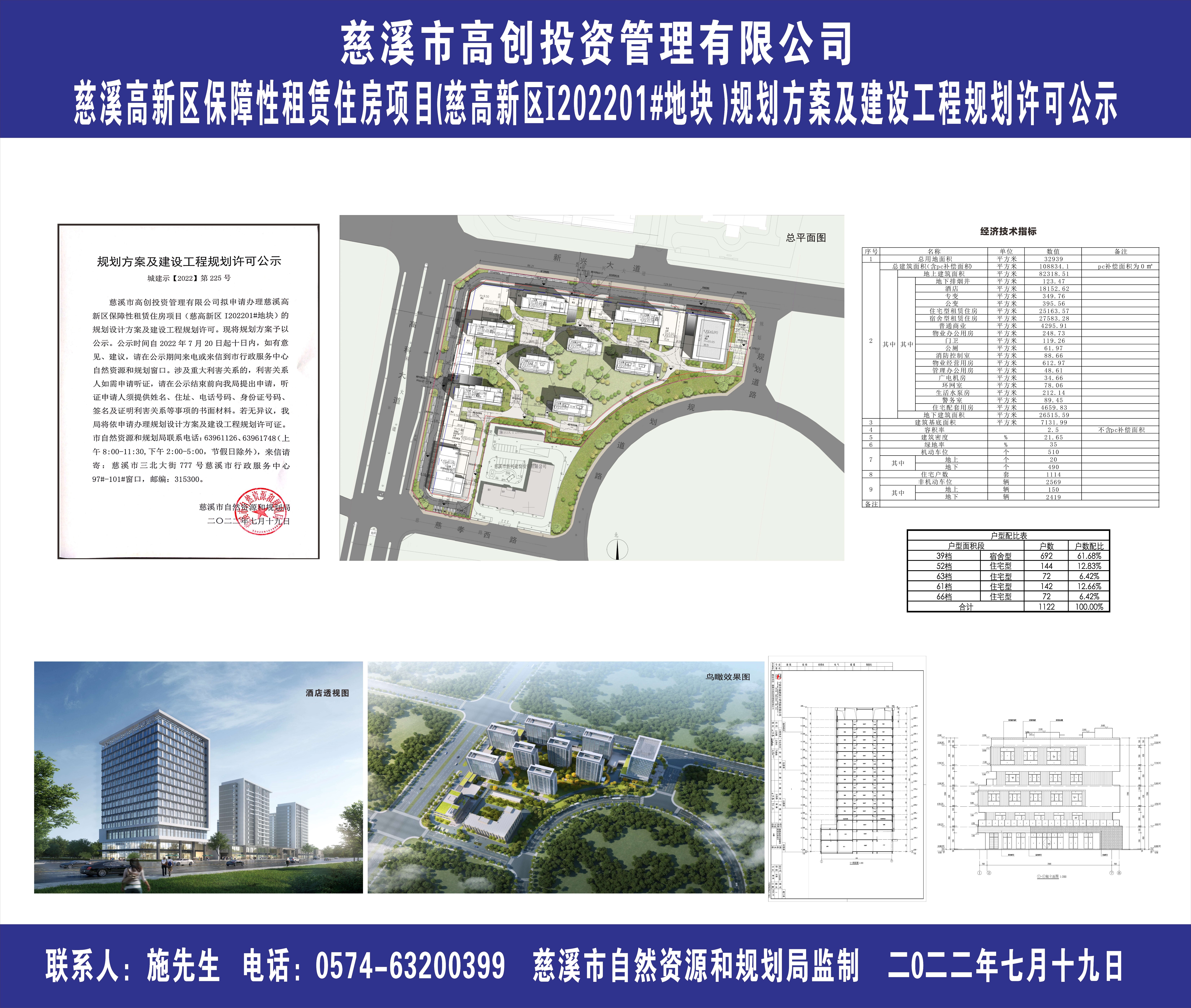 慈溪市高创投资管理有限公司拟申请办理慈溪高新区保障性租赁住房项目(慈高新区I202201#地块)的规划设计方案及建设工程规划许可。现将规划方案予以公示。公示时间自2022年7月20日起十日内,如有意见、建议,请在公示期间来电或来信到市行政服务中心自然资源和规划窗口。涉及重大利害关系的,利害关系人如需申请听证,请在公示结束前向我局提出申请,听证申请人须提供姓名、住址、电话号码、身份证号码、签名及证明利害关系等事项的书面材料。若无异议,我局将依申请办理规划设计方案及建设工程规划许可证。市自然资源和规划局联系电话:63961126、63961748(上午8:00-11:30,下午2:00-5:00,节假日除外),来信请寄:慈溪市三北大街777号慈溪市行政服务中心97#-101#窗口,邮编:315300。