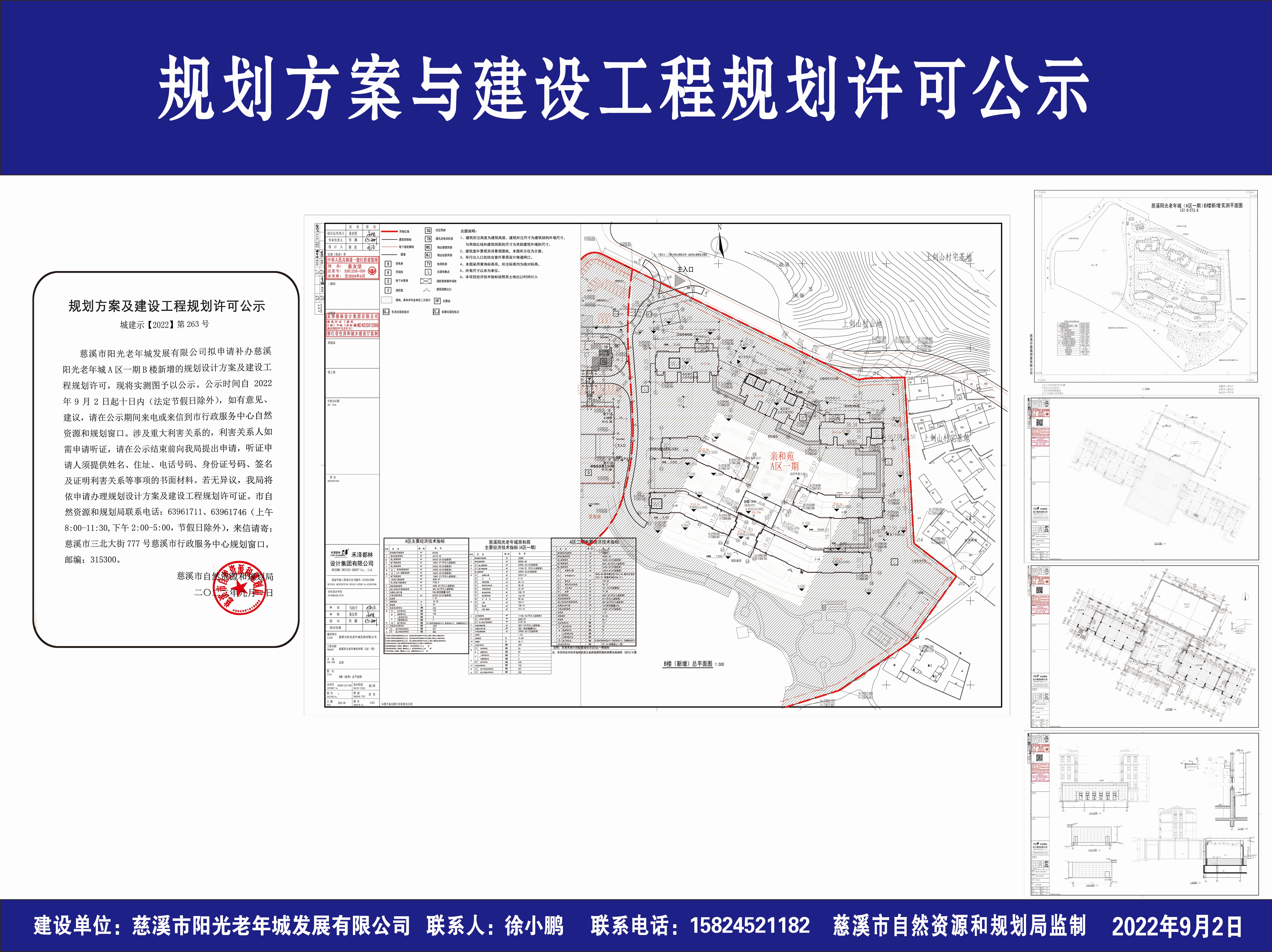 慈溪市阳光老年城发展有限公司拟申请补办慈溪阳光老年城A区一期B楼新增的规划设计方案及建设工程规划许可,现将实测图予以公示。公示时间自2022年9月2日起十日内(法定节假日除外),如有意见、建议,请在公示期间来电或来信到市行政服务中心自然资源和规划窗口。涉及重大利害关系的,利害关系人如需申请听证,请在公示结束前向我局提出申请,听证申请人须提供姓名、住址、电话号码、身份证号码、签名及证明利害关系等事项的书面材料。若无异议,我局将依申请办理规划设计方案及建设工程规划许可证。市自然资源和规划局联系电话:63961711、63961746(上午8:00-11:30,下午2:00-5:00,节假日除外),来信请寄:慈溪市三北大街777号慈溪市行政服务中心规划窗口,邮编:315300。