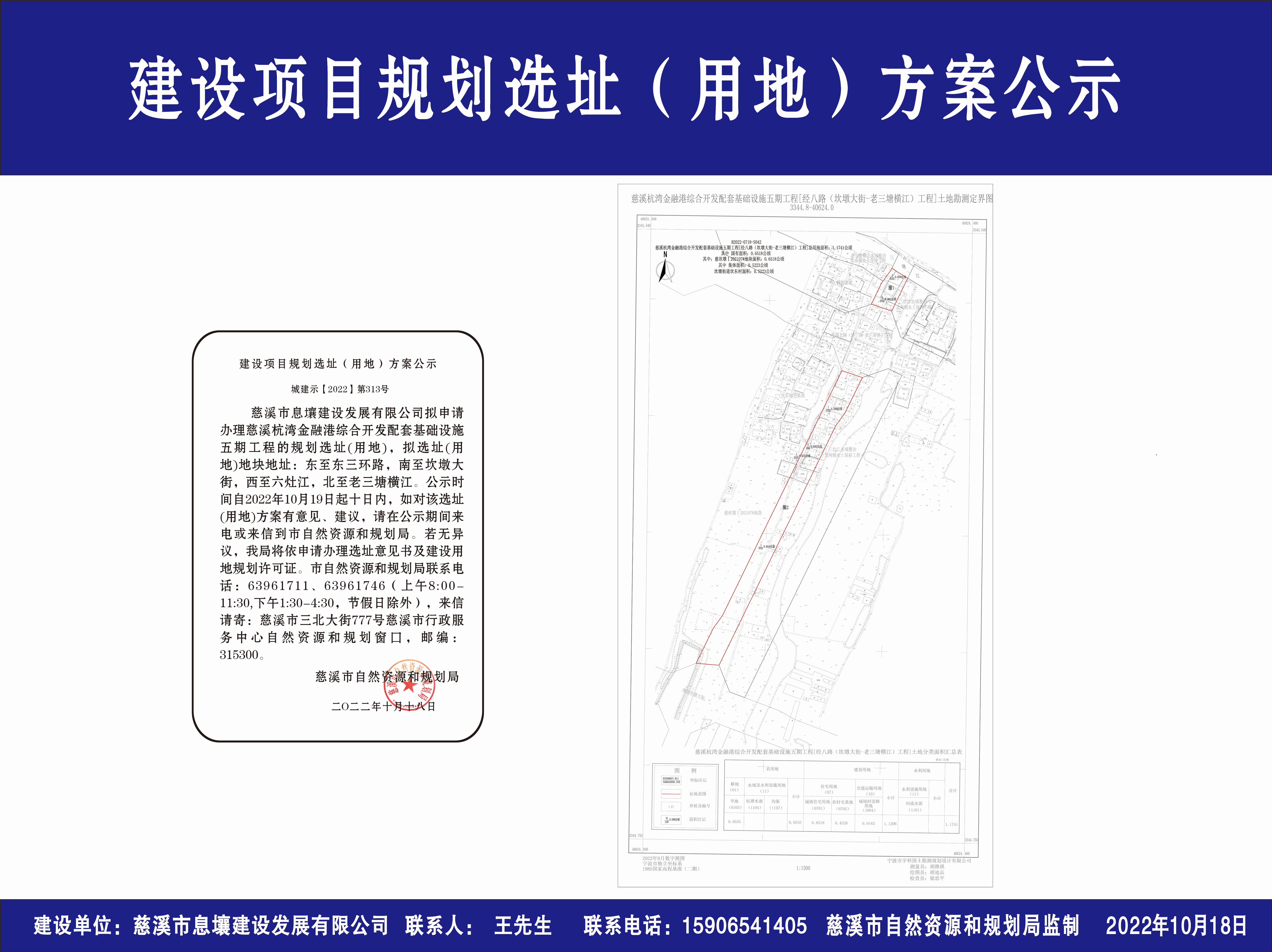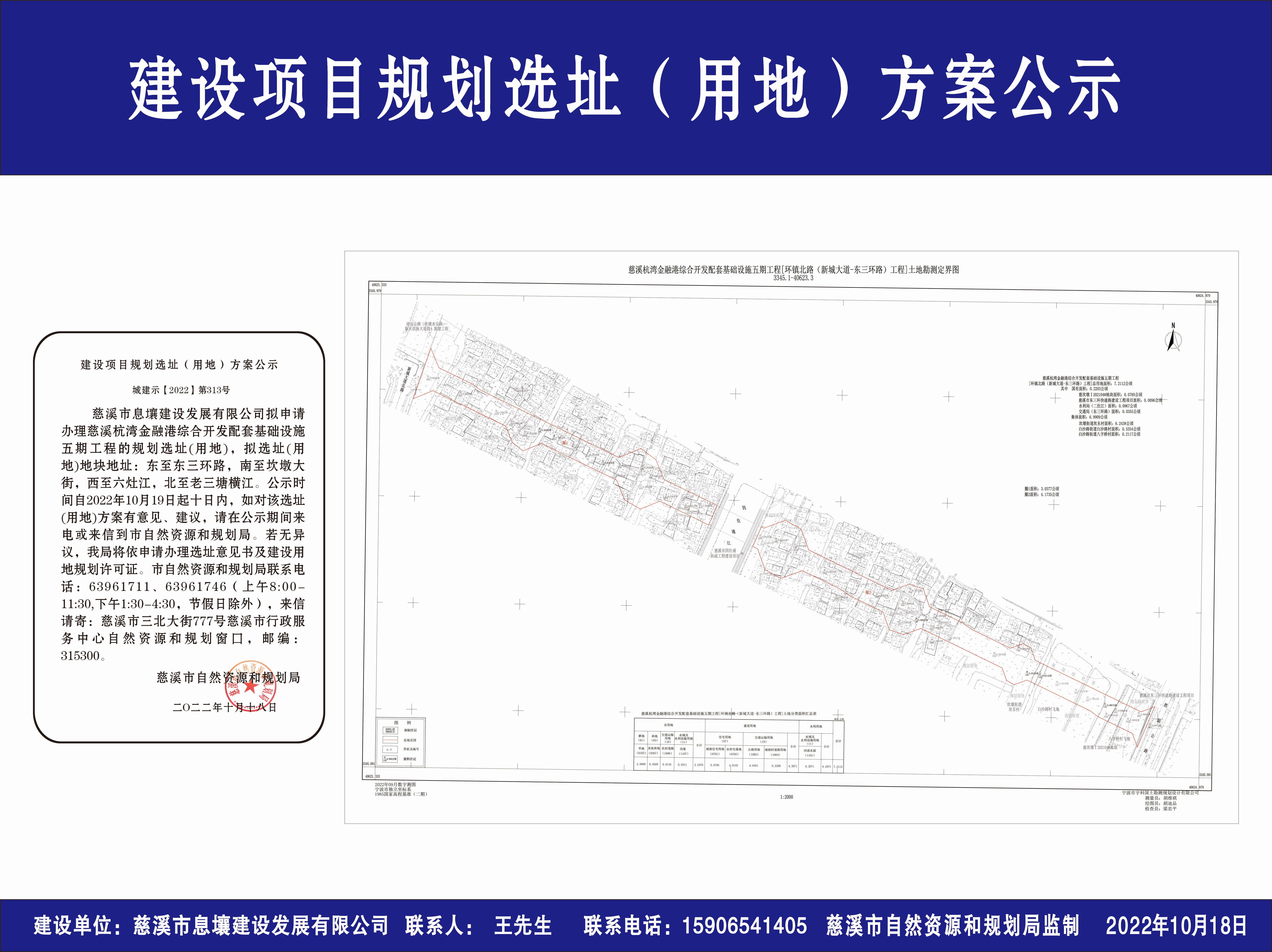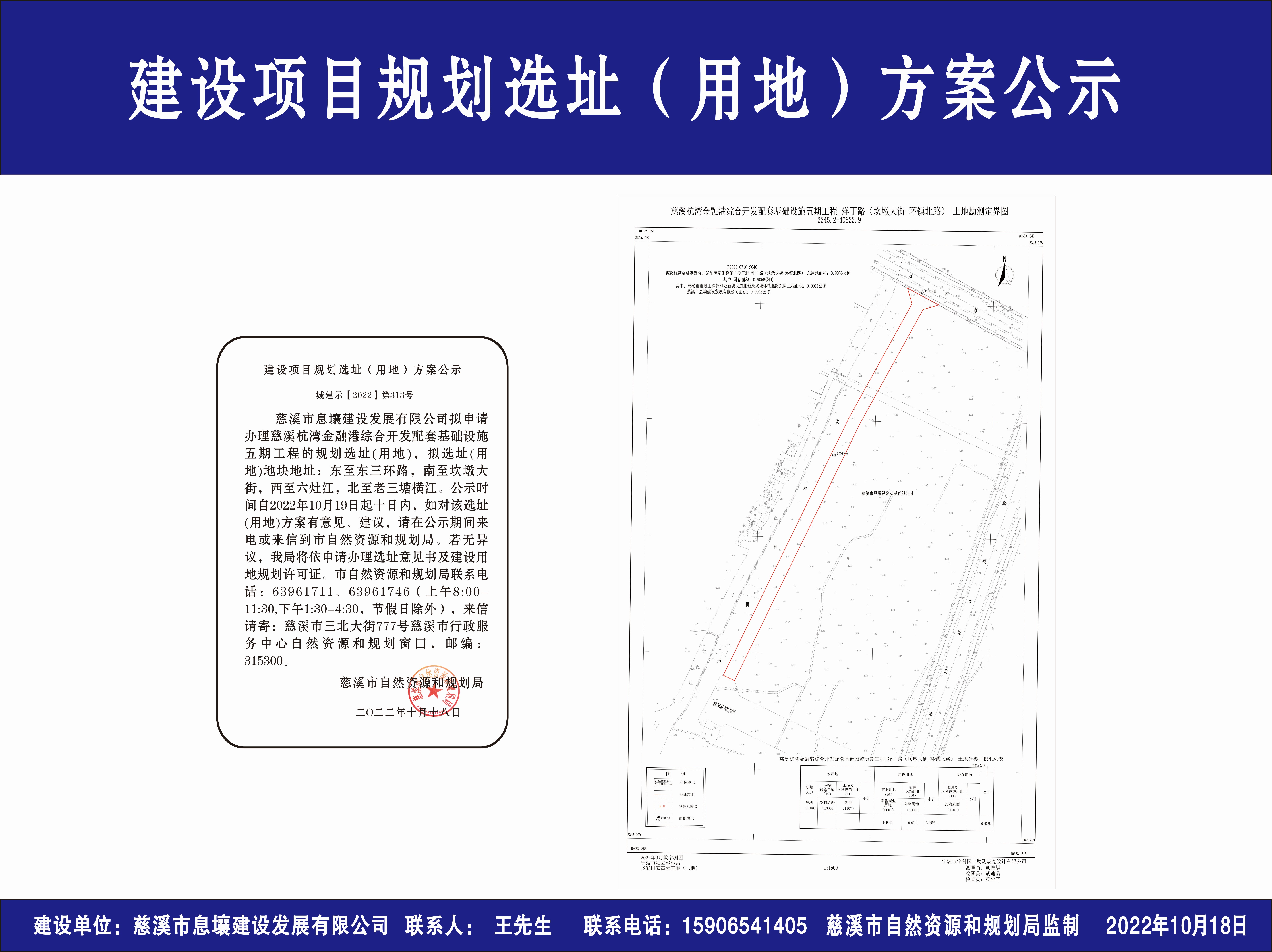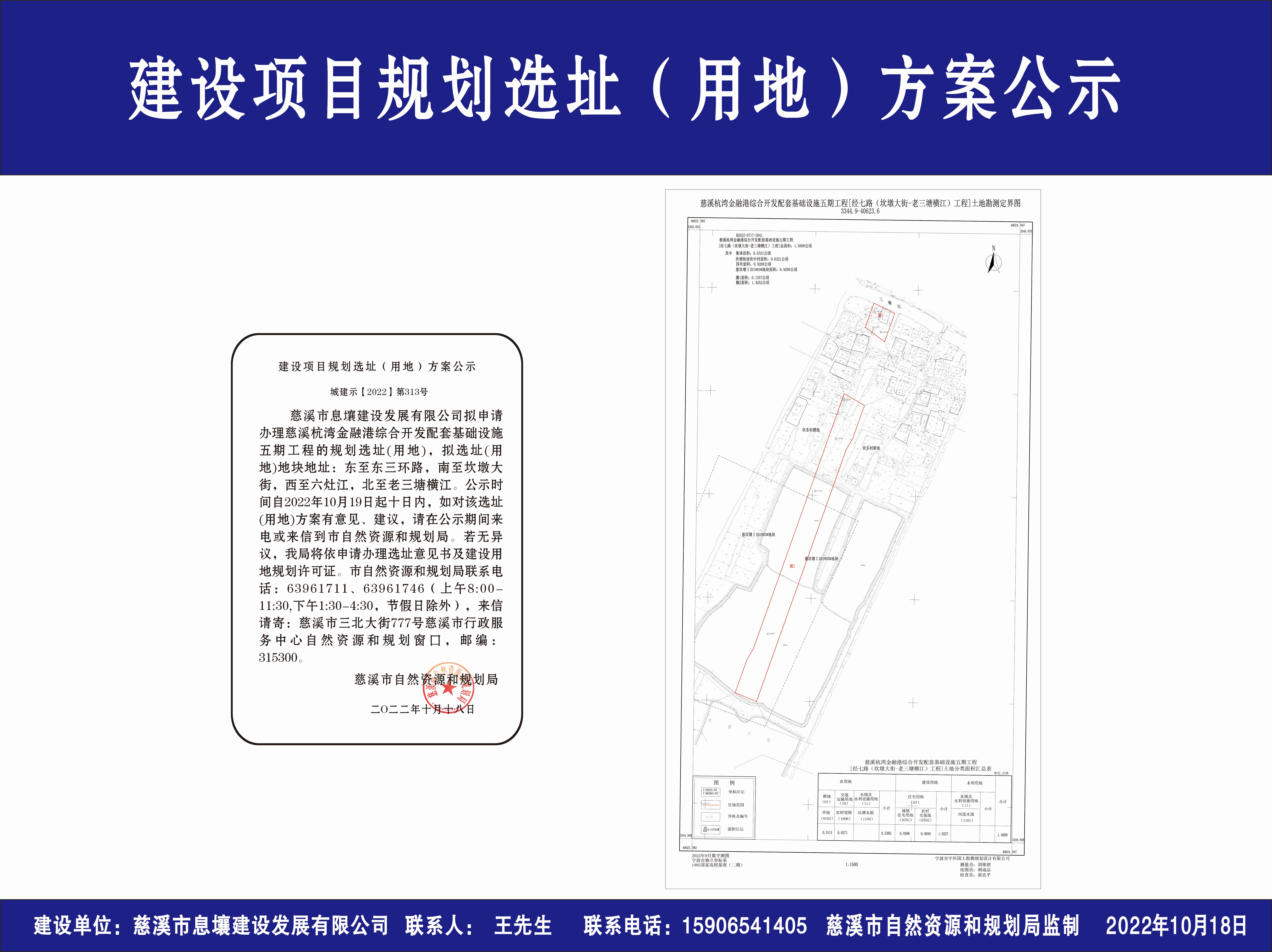 慈溪市息壤建设发展有限公司拟申请办理慈溪杭湾金融港综合开发配套基础设施五期工程的规划选址(用地),拟选址(用地)地块地址:东至东三环路,南至坎墩大街,西至六灶江,北至老三塘横江。公示时间自2022年10月19日起十日内,如对该选址(用地)方案有意见、建议,请在公示期间来电或来信到市自然资源和规划局。若无异议,我局将依申请办理选址意见书及建设用地规划许可证。市自然资源和规划局联系电话:63961711、63961746(上午8:00-11:30,下午1:30-4:30,节假日除外),来信请寄:慈溪市三北大街777号慈溪市行政服务中心自然资源和规划窗口,邮编:315300。