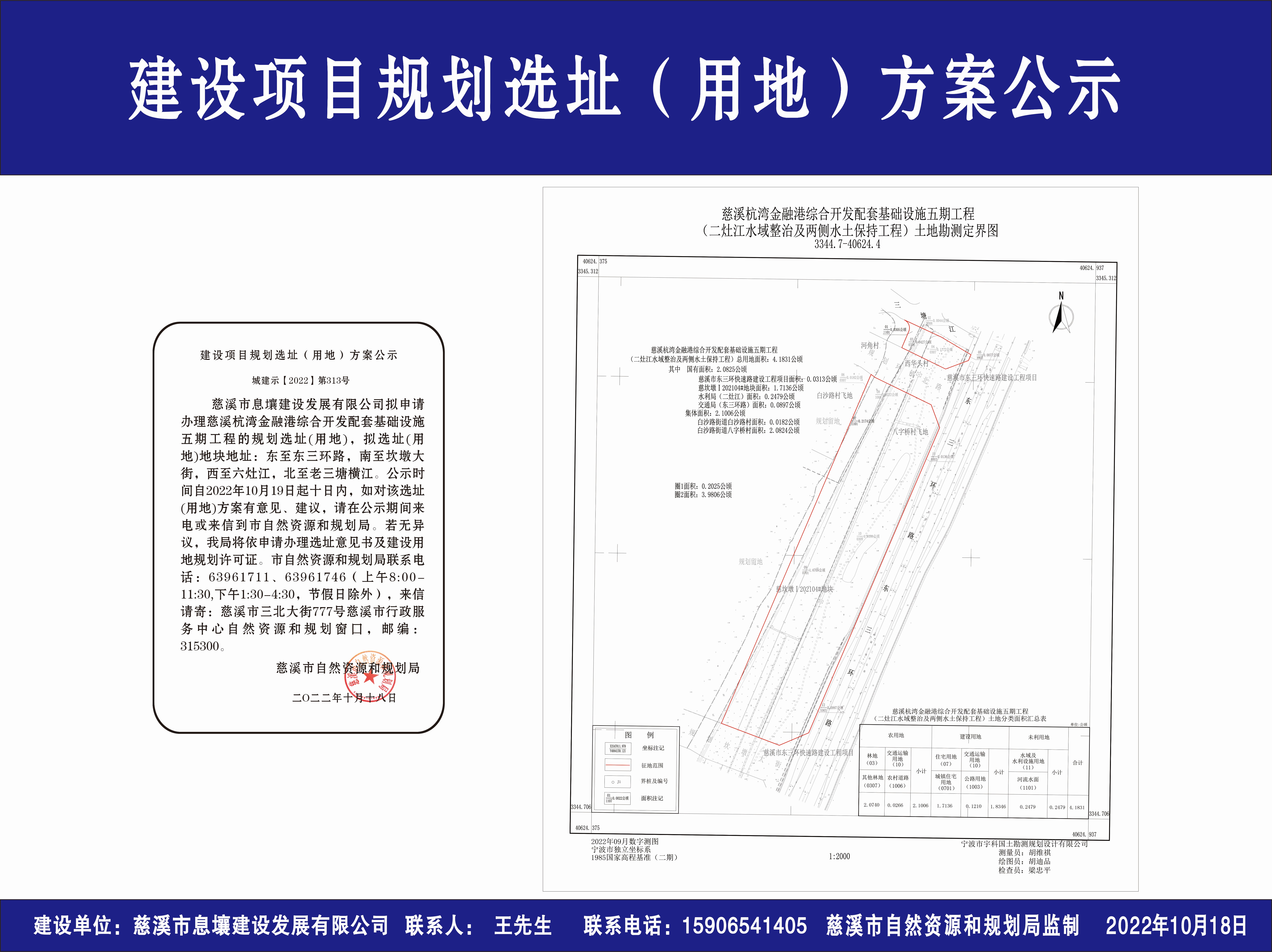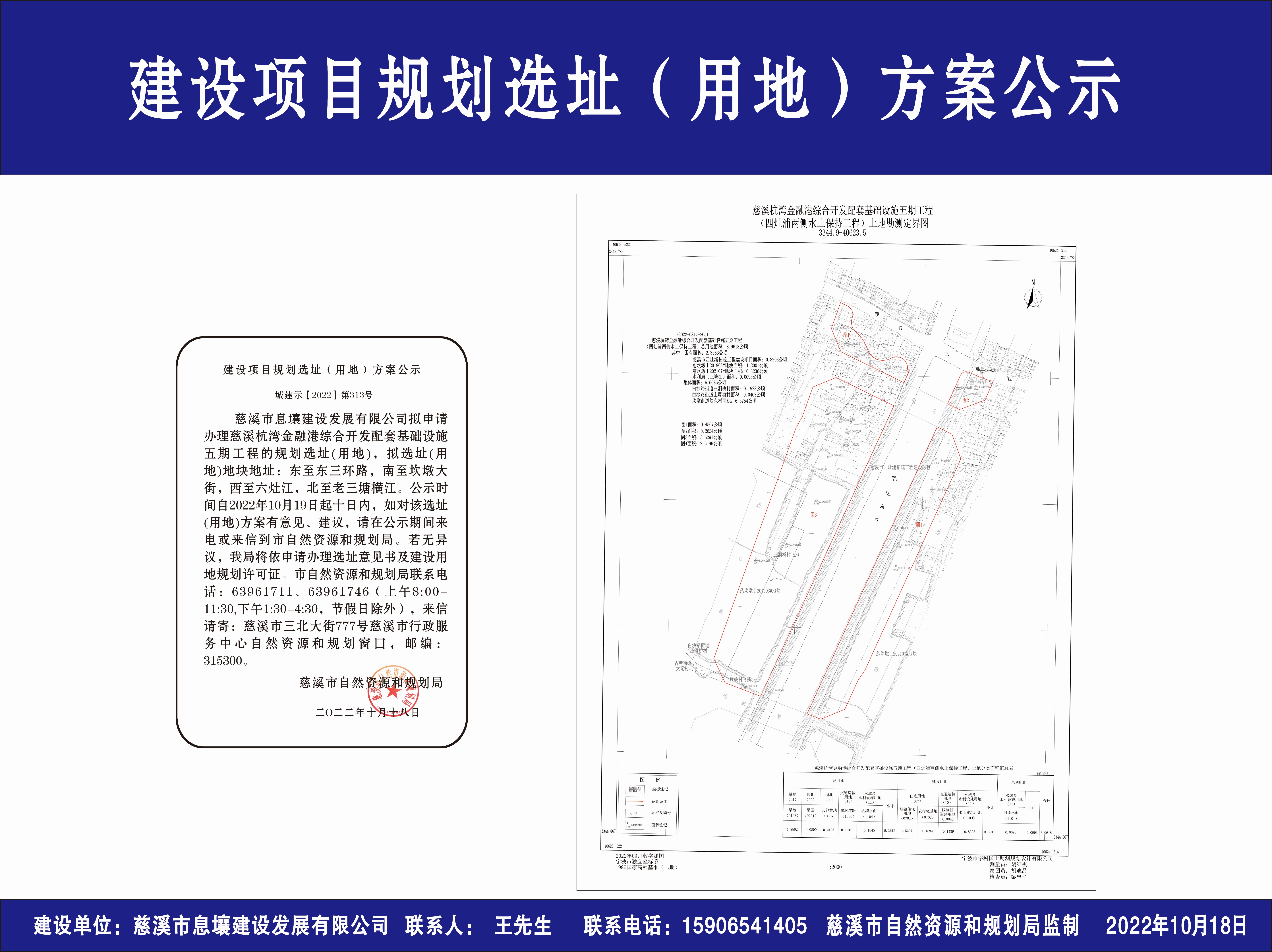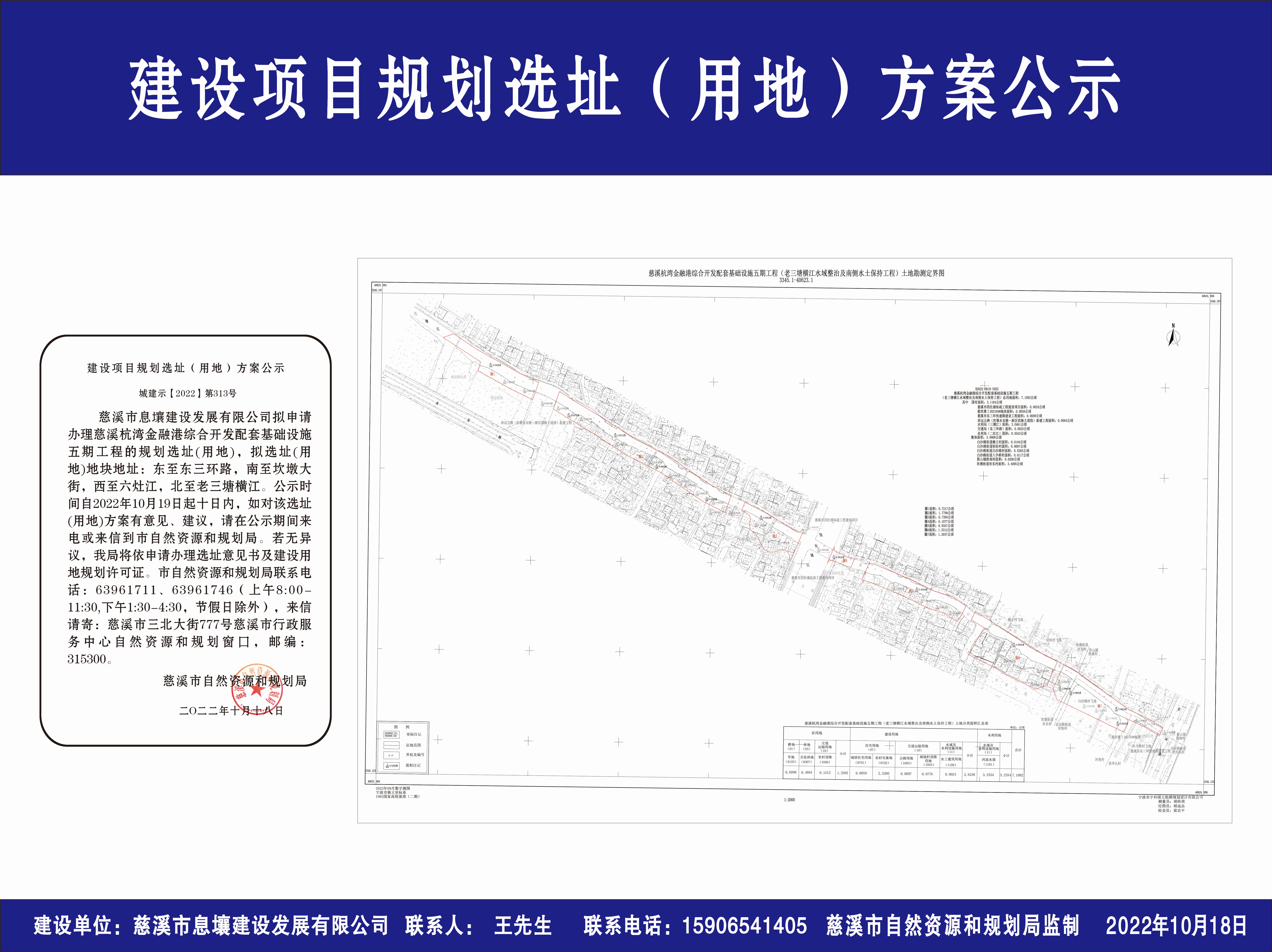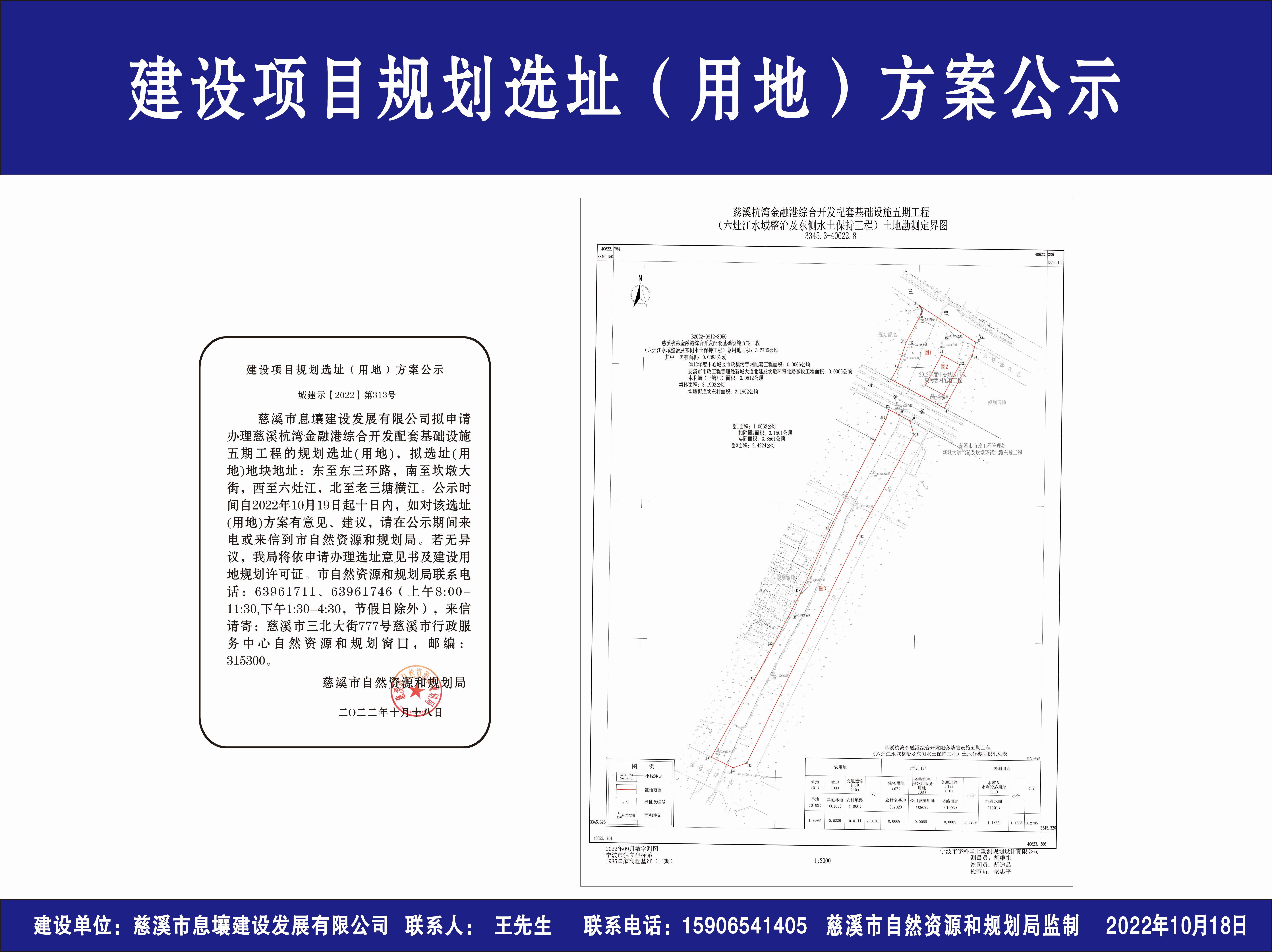 慈溪市息壤建设发展有限公司拟申请办理慈溪杭湾金融港综合开发配套基础设施五期工程的规划选址(用地),拟选址(用地)地块地址:东至东三环路,南至坎墩大街,西至六灶江,北至老三塘横江。公示时间自2022年10月19日起十日内,如对该选址(用地)方案有意见、建议,请在公示期间来电或来信到市自然资源和规划局。若无异议,我局将依申请办理选址意见书及建设用地规划许可证。市自然资源和规划局联系电话:63961711、63961746(上午8:00-11:30,下午1:30-4:30,节假日除外),来信请寄:慈溪市三北大街777号慈溪市行政服务中心自然资源和规划窗口,邮编:315300。