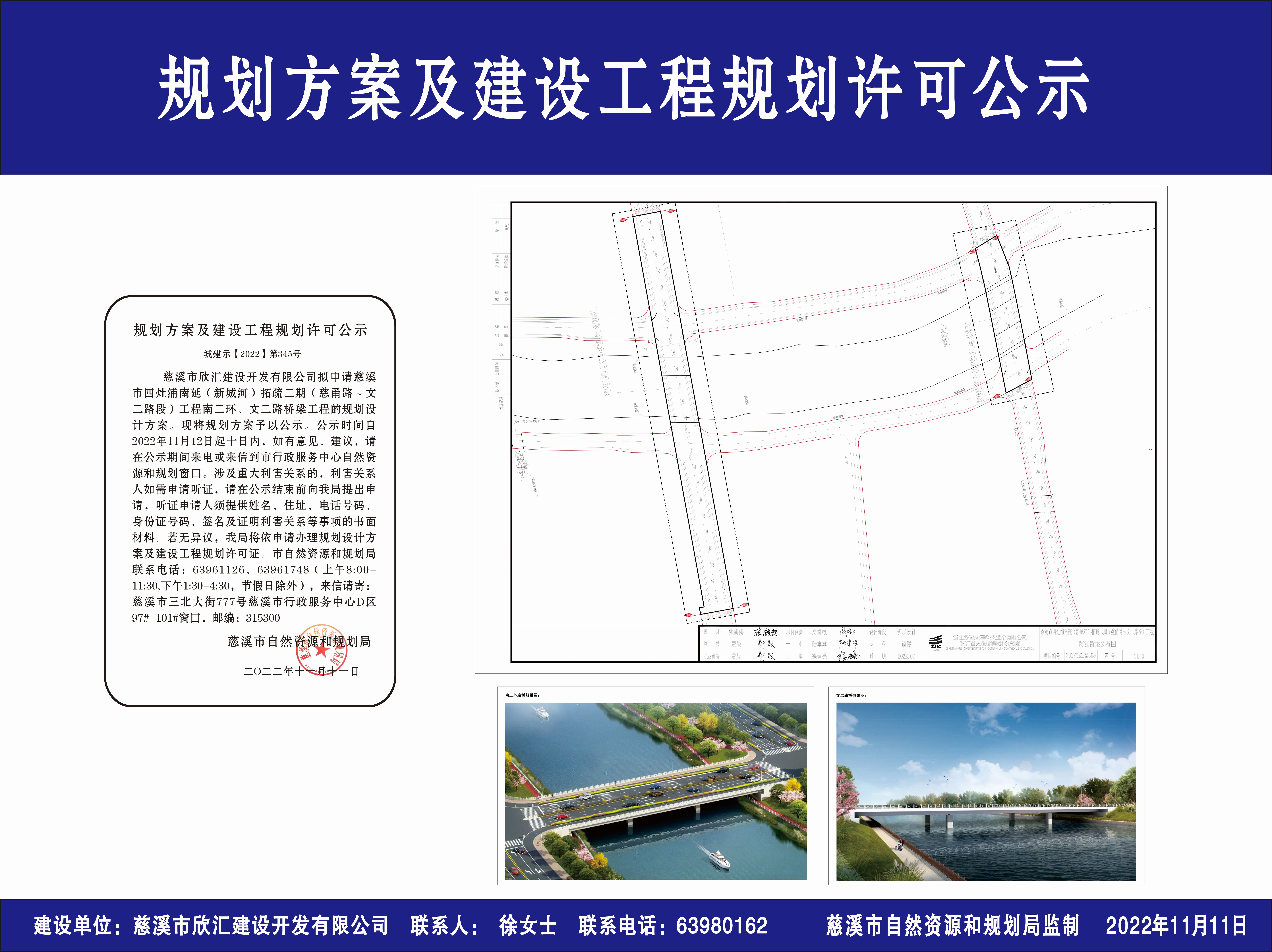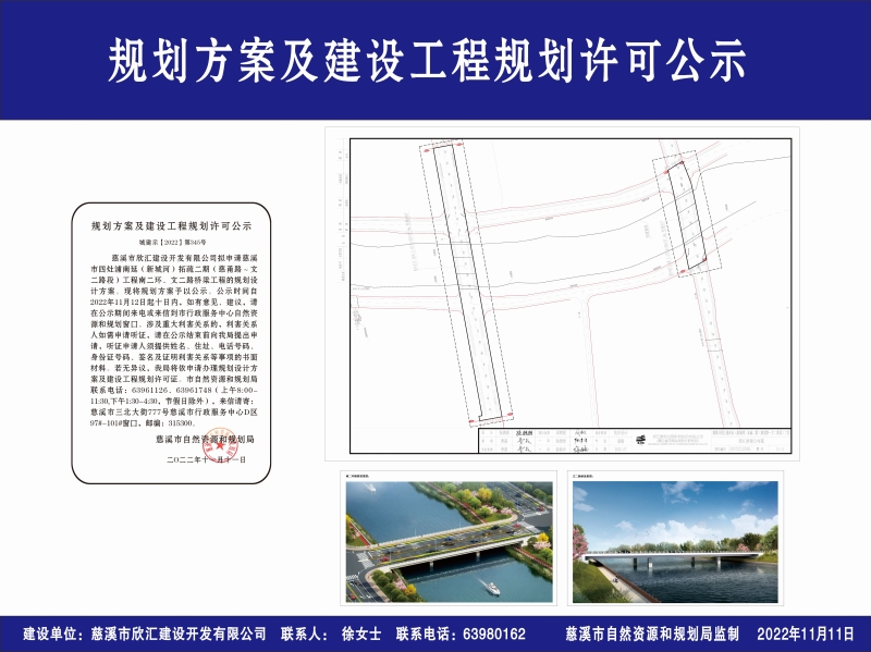 慈溪市欣汇建设开发有限公司拟申请慈溪市四灶浦南延(新城河)拓疏二期(慈甬路~文二路段)工程南二环、文二路桥梁工程的规划设计方案。现将规划方案予以公示。公示时间自2022年11月12日起十日内,如有意见、建议,请在公示期间来电或来信到市行政服务中心自然资源和规划窗口。涉及重大利害关系的,利害关系人如需申请听证,请在公示结束前向我局提出申请,听证申请人须提供姓名、住址、电话号码、身份证号码、签名及证明利害关系等事项的书面材料。若无异议,我局将依申请办理规划设计方案及建设工程规划许可证。市自然资源和规划局联系电话:63961126、63961748(上午8:00-11:30,下午1:30-4:30,节假日除外),来信请寄:慈溪市三北大街777号慈溪市行政服务中心D区97#-101#窗口,邮编:315300。