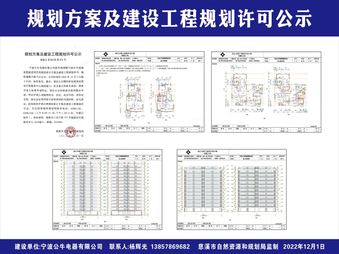 宁波公牛电器有限公司拟申请调整宁波公牛滨海家园建设项目的规划设计方案及建设工程规划许可,现将调整方案予以公示。公示时间自2022年12月2日起十日内,如有意见、建议,请在公示期间来电或来信到市行政服务中心规划窗口。涉及重大利害关系的,利害关系人如需申请听证,请在公示结束前向我局提出申请,听证申请人须提供姓名、住址、电话号码、身份证号码、签名及证明利害关系等事项的书面材料。若无异议,我局将依申请办理规划设计方案及建设工程规划许可证。市自然资源和规划局联系电话:63961126、63961748(上午8:00-11:30,下午1:30-4:30,节假日除外),来信请寄:慈溪市三北大街777号慈溪市行政服务中心101#窗口,邮编:315300。