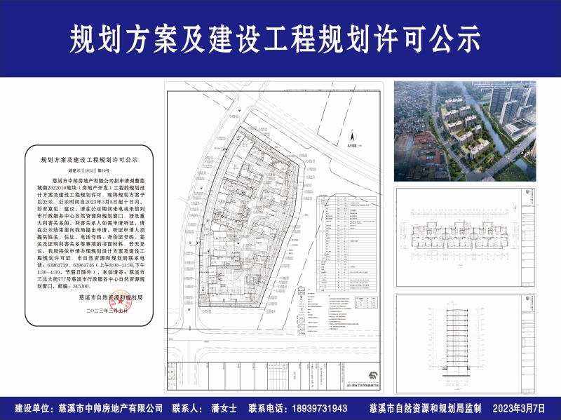 慈溪市中帅房地产有限公司拟申请调整慈城南202201#地块(房地产开发)工程的规划设计方案及建设工程规划许可。现将规划方案予以公示。公示时间自2023年3月8日起十日内,如有意见、建议,请在公示期间来电或来信到市行政服务中心自然资源和规划窗口。涉及重大利害关系的,利害关系人如需申请听证,请在公示结束前向我局提出申请,听证申请人须提供姓名、住址、电话号码、身份证号码、签名及证明利害关系等事项的书面材料。若无异议,我局将依申请办理规划设计方案及建设工程规划许可证。市自然资源和规划局联系电话:63961739、63961746(上午8:00-11:30,下午1:30-4:30,节假日除外),来信请寄:慈溪市三北大街777号慈溪市行政服务中心自然资源规划窗口,邮编:315300。