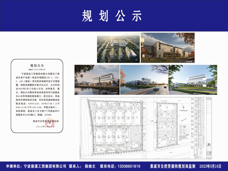 宁波慈溪工贸集团有限公司提交了慈溪未来产业园(商品市场园区13#-1、13#-2、14#-1地块)项目的详细城市设计方案调整,现将该调整的方案予以公示。公示时间自2023年3月17日起十日内,如有意见、建议,请在公示期间来电或来信到市行政服务中心自然资源和规划窗口。若无异议,我局将依申请审批该方案。市自然资源和规划局联系电话:63961126、63961748(上午8:00-11:30,下午1:30-4:30,节假日除外),来信请寄:慈溪市三北大街777号慈溪市行政服务中心98#窗口,邮编:315300。