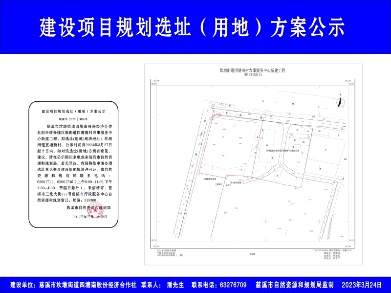 慈溪市坎墩街道四塘南股份经济合作社拟申请办理坎墩街道四塘南村农事服务中心新建工程,拟选址(用地)地块地址:坎墩街道五塘新村。公示时间自2023年3月27日起十日内,如对该选址(用地)方案有意见、建议,请在公示期间来电或来信到市自然资源和规划局。若无异议,我局将依申请办理选址意见书及建设用地规划许可证。市自然资源和规划局联系电话:63961711、63961746(上午8:00-11:30,下午1:30-4:30,节假日除外),来信请寄:慈溪市三北大街777号慈溪市行政服务中心自然资源和规划窗口,邮编:315300。