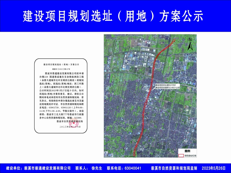 慈溪市慈通建设发展有限公司拟申请办理228 国道慈溪庵东至余姚梨洲段工程(余慈大道城市北环至周浒公路段)的规划选址(用地),拟选址(用地)地址:西三环路上(余慈大道城市北环北侧至周浒公路)。公示时间自2023年5月27日起十日内,如对该选址(用地)方案有意见、建议,请在公示期间来电或来信到市自然资源和规划局。若无异议,我局将依申请办理选址意见书及建设用地规划许可证。市自然资源和规划局联系电话:63961739、63961126(上午8:00-11:30,下午1:30-4:30,节假日除外),来信请寄:慈溪市三北大街777号慈溪市行政服务中心自然资源和规划局,邮编:315300。