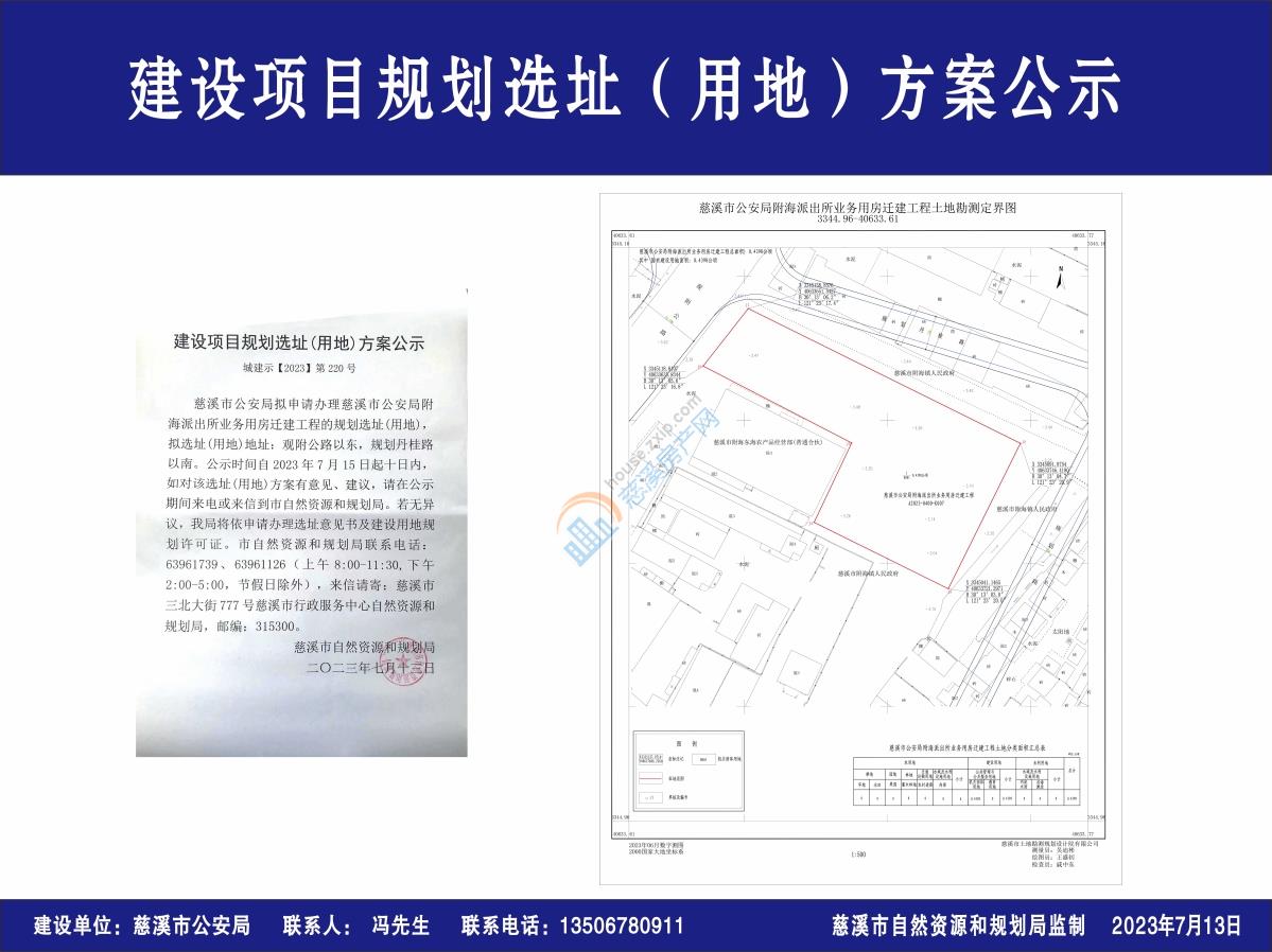 慈溪市公安局拟申请办理慈溪市公安局附海派出所业务用房迁建工程的规划选址(用地),拟选址(用地)地址:观附公路以东,规划丹桂路以南。公示时间自2023年7月15日起十日内,如对该选址(用地)方案有意见、建议,请在公示期间来电或来信到市自然资源和规划局。若无异议,我局将依申请办理选址意见书及建设用地规划许可证。市自然资源和规划局联系电话:63961739、63961126(上午8:00-11:30,下午2:00-5:00,节假日除外),来信请寄:慈溪市三北大街777号慈溪市行政服务中心自然资源和规划局,邮编:315300。