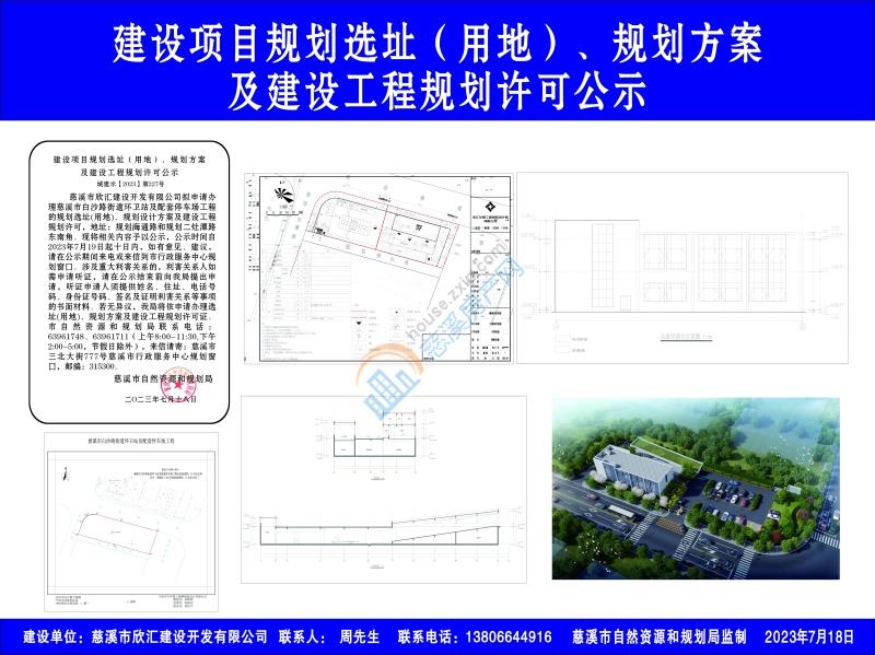 慈溪市欣汇建设开发有限公司拟申请办理慈溪市白沙路街道环卫站及配套停车场工程的规划选址(用地)、规划设计方案及建设工程规划许可,地址:规划海通路和规划二灶潭路东南角。现将相关内容予以公示,公示时间自2023年7月19日起十日内,如有意见、建议,请在公示期间来电或来信到市行政服务中心规划窗口。涉及重大利害关系的,利害关系人如需申请听证,请在公示结束前向我局提出申请,听证申请人须提供姓名、住址、电话号码、身份证号码、签名及证明利害关系等事项的书面材料。若无异议,我局将依申请办理选址(用地)、规划方案及建设工程规划许可证。市自然资源和规划局联系电话:63961748、63961711(上午8:00-11:30,下午2:00-5:00,节假日除外),来信请寄:慈溪市三北大街777号慈溪市行政服务中心规划窗口,邮编:315300。