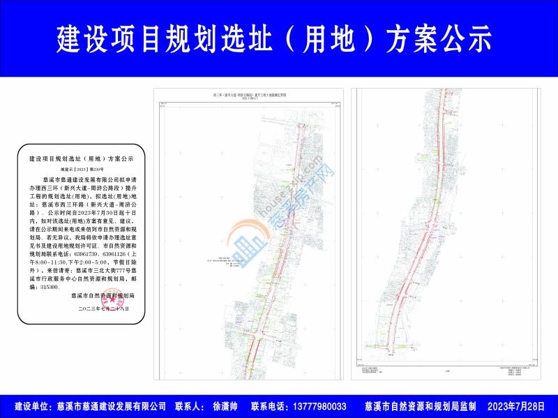 慈溪市慈通建设发展有限公司拟申请办理西三环(新兴大道-周浒公路段)提升工程的规划选址(用地),拟选址(用地)地址:慈溪市西三环路(新兴大道-周浒公路)。公示时间自2023年7月30日起十日内,如对该选址(用地)方案有意见、建议,请在公示期间来电或来信到市自然资源和规划局。若无异议,我局将依申请办理选址意见书及建设用地规划许可证。市自然资源和规划局联系电话:63961739、63961126(上午8:00-11:30,下午2:00-5:00,节假日除外),来信请寄:慈溪市三北大街777号慈溪市行政服务中心自然资源和规划局,邮编:315300。