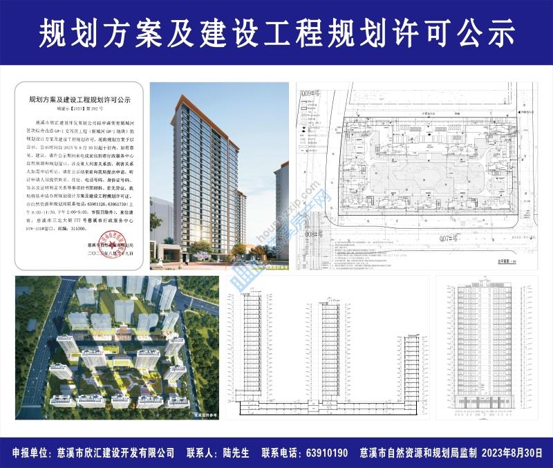 慈溪市欣汇建设开发有限公司拟申请变更新城河区块综合改造G#-1安置房工程(新城河G#-1地块)的规划设计方案及建设工程规划许可,现将规划方案予以公示。公示时间自2023年8月30日起十日内,如有意见、建议,请在公示期间来电或来信到市行政服务中心自然资源和规划窗口。涉及重大利害关系的,利害关系人如需申请听证,请在公示结束前向我局提出申请,听证申请人须提供姓名、住址、电话号码、身份证号码、签名及证明利害关系等事项的书面材料。若无异议,我局将依申请办理规划设计方案及建设工程规划许可证。市自然资源和规划局联系电话:63961126、63961739(上午8:00-11:30,下午2:00-5:00,节假日除外),来信请寄:慈溪市三北大街777号慈溪市行政服务中心97#-101#窗口,邮编:315300。