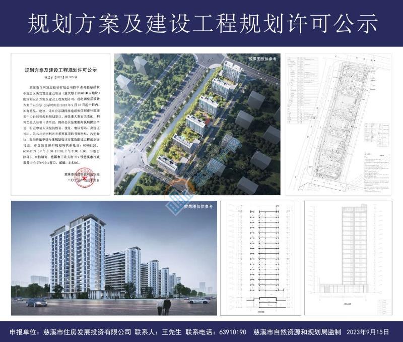慈溪市住房发展投资有限公司拟申请调整慈溪坎中宜居区块安置房建设项目(慈坎墩I202001#-A地块)的规划设计方案及建设工程规划许可,现将调整后设计方案予以公示。公示时间自2023年9月15日起十日内,如有意见、建议,请在公示期间来电或来信到市行政服务中心自然资源和规划窗口。涉及重大利害关系的,利害关系人如需申请听证,请在公示结束前向我局提出申请,听证申请人须提供姓名、住址、电话号码、身份证号码、签名及证明利害关系等事项的书面材料。若无异议,我局将依申请办理规划设计方案及建设工程规划许可证。市自然资源和规划局联系电话:63961126、63961739(上午8:00-11:30,下午2:00-5:00,节假日除外),来信请寄:慈溪市三北大街777号慈溪市行政服务中心97#-101#窗口,邮编:315300。