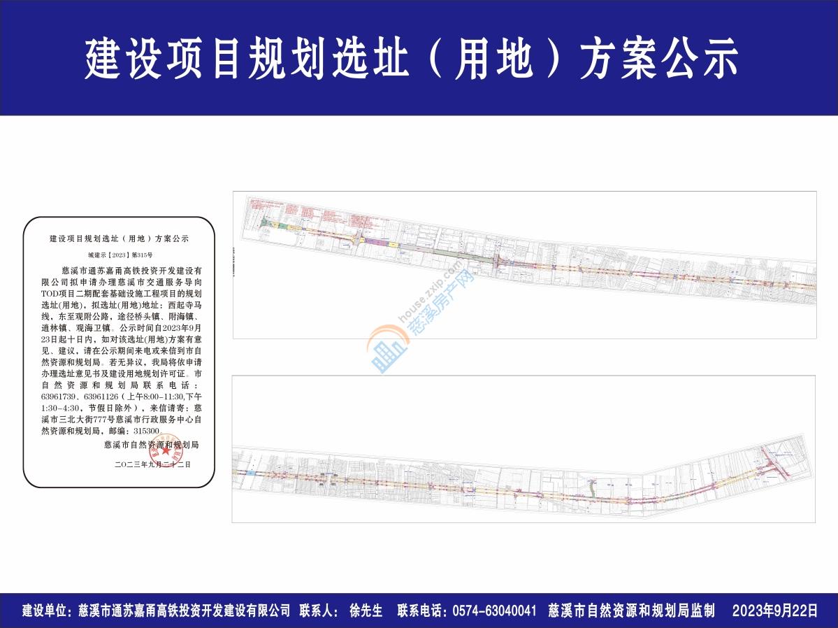 慈溪市通苏嘉甬高铁投资开发建设有限公司拟申请办理慈溪市交通服务导向TOD项目二期配套基础设施工程项目的规划选址(用地),拟选址(用地)地址:西起寺马线,东至观附公路,途径桥头镇、附海镇、逍林镇、观海卫镇。公示时间自2023年9月23日起十日内,如对该选址(用地)方案有意见、建议,请在公示期间来电或来信到市自然资源和规划局。若无异议,我局将依申请办理选址意见书及建设用地规划许可证。市自然资源和规划局联系电话:63961739、63961126(上午8:00-11:30,下午1:30-4:30,节假日除外),来信请寄:慈溪市三北大街777号慈溪市行政服务中心自然资源和规划局,邮编:315300。