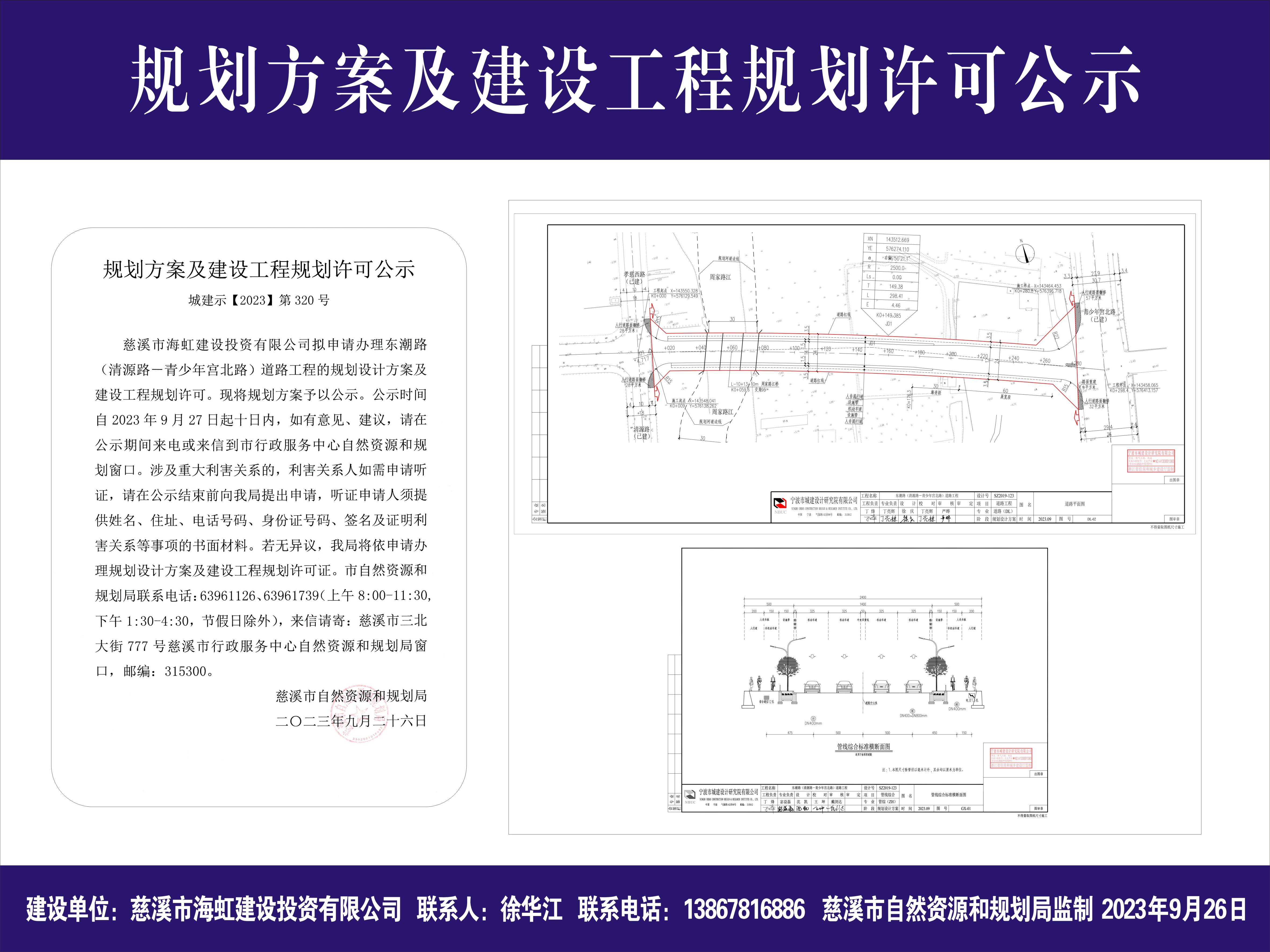 慈溪市海虹建设投资有限公司拟申请办理东潮路(清源路-青少年宫北路)道路工程的规划设计方案及建设工程规划许可。现将规划方案予以公示。公示时间自2023年9月27日起十日内,如有意见、建议,请在公示期间来电或来信到市行政服务中心自然资源和规划窗口。涉及重大利害关系的,利害关系人如需申请听证,请在公示结束前向我局提出申请,听证申请人须提供姓名、住址、电话号码、身份证号码、签名及证明利害关系等事项的书面材料。若无异议,我局将依申请办理规划设计方案及建设工程规划许可证。市自然资源和规划局联系电话:63961126、63961739(上午8:00-11:30,下午1:30-4:30,节假日除外),来信请寄:慈溪市三北大街777号慈溪市行政服务中心自然资源和规划局窗口,邮编:315300。