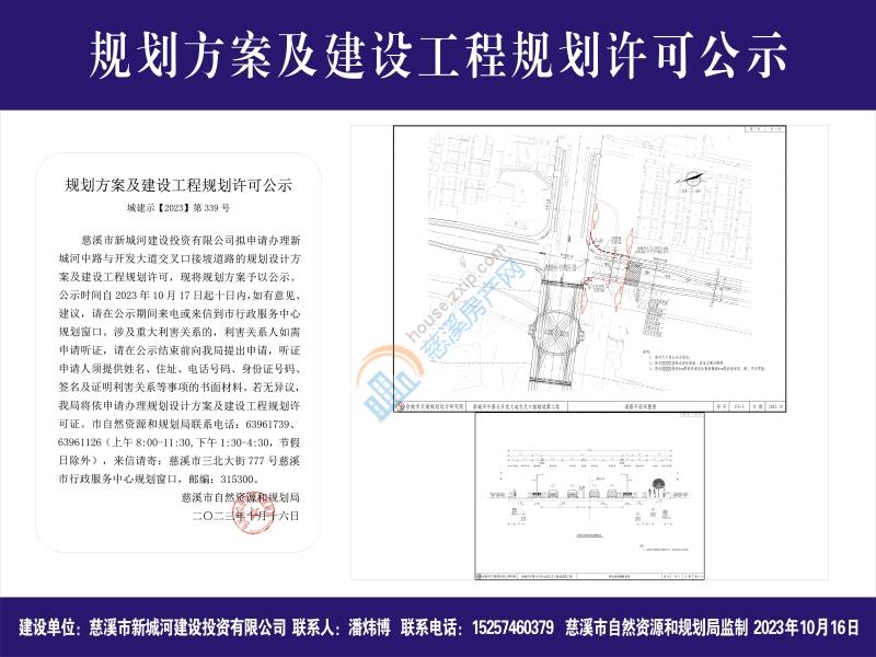 溪市新城河建设投资有限公司拟申请办理新城河中路与开发大道交叉口接坡道路的规划设计方案及建设工程规划许可,现将规划方案予以公示。公示时间自2023年10月17日起十日内,如有意见、建议,请在公示期间来电或来信到市行政服务中心规划窗口。涉及重大利害关系的,利害关系人如需申请听证,请在公示结束前向我局提出申请,听证申请人须提供姓名、住址、电话号码、身份证号码、签名及证明利害关系等事项的书面材料。若无异议,我局将依申请办理规划设计方案及建设工程规划许可证。市自然资源和规划局联系电话:63961739、63961126(上午8:00-11:30,下午1:30-4:30,节假日除外),来信请寄:慈溪市三北大街777号慈溪市行政服务中心规划窗口,邮编:315300。