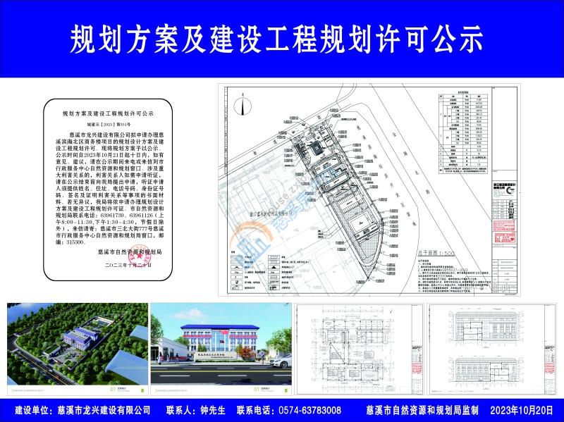 慈溪市龙兴建设有限公司拟申请办理慈溪滨海北区商务楼项目的规划设计方案及建设工程规划许可。现将规划方案予以公示。公示时间自2023年10月21日起十日内,如有意见、建议,请在公示期间来电或来信到市行政服务中心自然资源和规划窗口。涉及重大利害关系的,利害关系人如需申请听证,请在公示结束前向我局提出申请,听证申请人须提供姓名、住址、电话号码、身份证号码、签名及证明利害关系等事项的书面材料。若无异议,我局将依申请办理规划设计方案及建设工程规划许可证。市自然资源和规划局联系电话:63961739、63961126(上午8:00-11:30,下午1:30-4:30,节假日除外),来信请寄:慈溪市三北大街777号慈溪市行政服务中心自然资源和规划局窗口,邮编:315300。