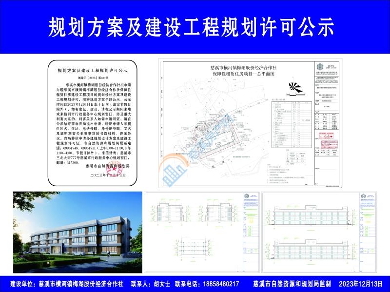慈溪市横河镇梅湖股份经济合作社拟申请办理慈溪市横河镇梅湖股份经济合作社保障性租赁住房建设工程项目的规划设计方案及建设工程规划许可,现将规划方案予以公示。公示时间自2023年12月14日起十日内(法定节假日除外),如有意见、建议,请在公示期间来电或来信到市行政服务中心规划窗口。涉及重大利害关系的,利害关系人如需申请听证,请在公示结束前向我局提出申请,听证申请人须提供姓名、住址、电话号码、身份证号码、签名及证明利害关系等事项的书面材料。若无异议,我局将依申请办理规划设计方案及建设工程规划许可证。市自然资源和规划局联系电话:63961748、63961711(上午8:00-11:30,下午1:30-4:30,节假日除外),来信请寄:慈溪市三北大街777号慈溪市行政服务中心规划窗口,邮编:315300。