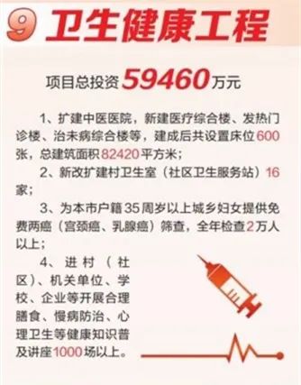 1、扩建中医医院,新建医疗综合楼、发热门诊楼、治未病综合楼等,建成后共设置床位 600张,总建筑面积82420平方米;