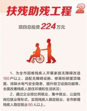 1、为全市困难残疾人开展家庭无障碍改造160户以上,适配无障碍设施,修茸粉刷屋顶墙面,排除水电气安全隐患,提升厨卫设施功能等全面改善残疾人居住环境和生活状况;