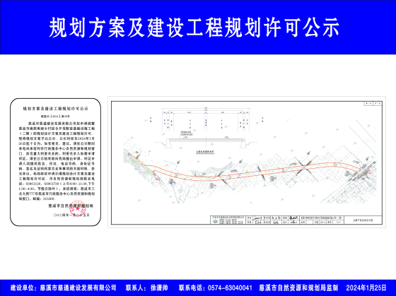 慈溪市慈通建设发展有限公司拟申请调整慈溪市南部美丽乡村综合开发配套基础设施工程(二期)的规划设计方案及建设工程规划许可。现将规划方案予以公示。公示时间自2024年1月26日起十日内,如有意见、建议,请在公示期间来电或来信到市行政服务中心自然资源和规划窗口。涉及重大利害关系的,利害关系人如需申请听证,请在公示结束前向我局提出申请,听证申请人须提供姓名、住址、电话号码、身份证号码、签名及证明利害关系等事项的书面材料。若无异议,我局将依申请办理规划设计方案及建设工程规划许可证。市自然资源和规划局联系电话:63961126、63961739(上午8:00-11:30,下午1:30-4:30,节假日除外),来信请寄:慈溪市三北大街777号慈溪市行政服务中心自然资源和规划局窗口,邮编:315300。