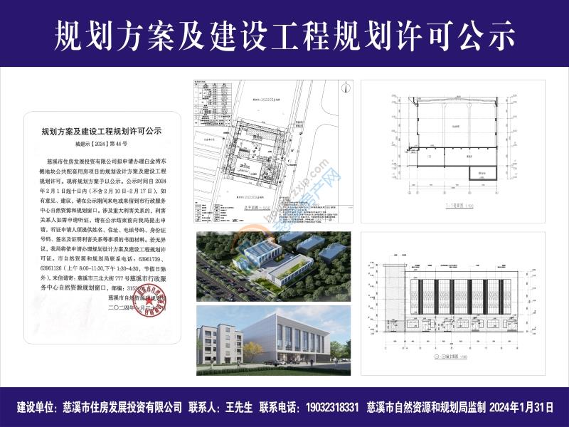 慈溪市住房发展投资有限公司拟申请办理白金湾东侧地块公共配套用房项目的规划设计方案及建设工程规划许可。现将规划方案予以公示。公示时间自2024年2月1日起十日内(不含2月10日-2月17日),如有意见、建议,请在公示期间来电或来信到市行政服务中心自然资源和规划窗口。涉及重大利害关系的,利害关系人如需申请听证,请在公示结束前向我局提出申请,听证申请人须提供姓名、住址、电话号码、身份证号码、签名及证明利害关系等事项的书面材料。若无异议,我局将依申请办理规划设计方案及建设工程规划许可证。市自然资源和规划局联系电话:63961739、63961126(上午8:00-11:30,下午1:30-4:30,节假日除外),来信请寄:慈溪市三北大街777号慈溪市行政服务中心自然资源规划窗口,邮编:315300。