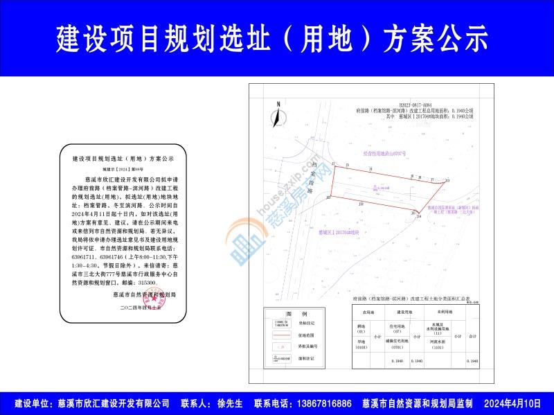 慈溪市欣汇建设开发有限公司拟申请办理府前路(档案管路-滨河路)改建工程的规划选址(用地),拟选址(用地)地块地址:档案管路,冬至滨河路。公示时间自2024年4月11日起十日内,如对该选址(用地)方案有意见、建议,请在公示期间来电或来信到市自然资源和规划局。若无异议,我局将依申请办理选址意见书及建设用地规划许可证。市自然资源和规划局联系电话:63961711、63961746(上午8:00-11:30,下午1:30-4:30,节假日除外),来信请寄:慈溪市三北大街777号慈溪市行政服务中心自然资源和规划窗口,邮编:315300。