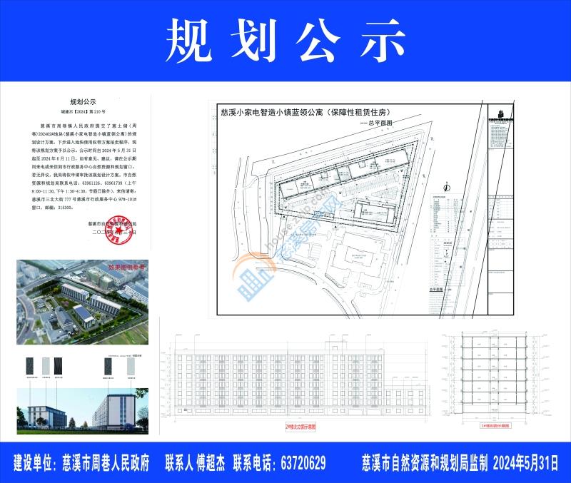 慈溪市周巷镇人民政府提交了慈土储(周巷)202402#地块(慈溪小家电智造小镇蓝领公寓)的规划设计方案,下步进入地块使用权带方案拍卖程序,现将该规划方案予以公示。公示时间自2024年5月31日起至2024年6月11日,如有意见、建议,请在公示期间来电或来信到市行政服务中心自然资源和规划窗口。若无异议,我局将依申请审批该规划设计方案。市自然资源和规划局联系电话:63961126、63961739(上午8:00-11:30,下午1:30-4:30,节假日除外),来信请寄:慈溪市三北大街777号慈溪市行政服务中心97#-101#窗口,邮编:315300。