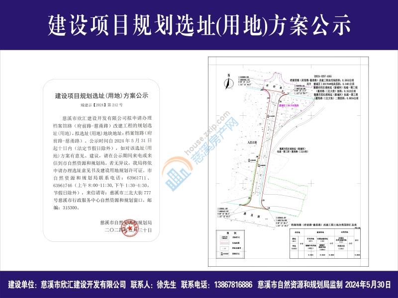 慈溪市欣汇建设开发有限公司拟申请办理档案馆路(府前路-慈甬路)改建工程的规划选址(用地),拟选址(用地)地块地址:档案馆路(府前路-慈甬路)。公示时间自2024年5月31日起十日内(法定节假日除外),如对该选址(用地)方案有意见、建议,请在公示期间来电或来信到市自然资源和规划局。若无异议,我局将依申请办理选址意见书及建设用地规划许可证。市自然资源和规划局联系电话:63961711、63961746(上午8:00-11:30,下午1:30-4:30,节假日除外),来信请寄:慈溪市三北大街777号慈溪市行政服务中心自然资源和规划窗口,邮编:315300。