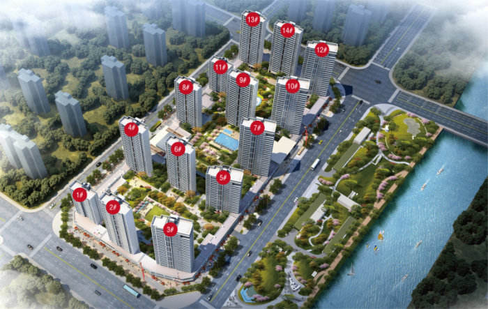 项目简介:本项目处于新城河板块,位于白沙路街道。总用地面积107630平方米,规划总建筑面积429630.64平方米(其中住宅303906.37平方米,商业11777.10平方米),容积率:3.0,绿地率:35.01%,住宅户数1717户。
