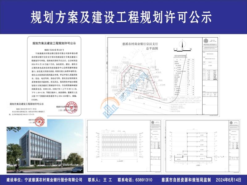 宁波慈溪农村商业银行股份有限公司拟申请办理宗汉支行营业大楼建设工程的规划设计方案及建设工程规划许可审批,现将相关资料予以公示。公示时间自2024年6月25日起至2024年7月4日,如有意见、建议,请在公示期间来电或来信到市政务服务中心自然资源和规划窗口。涉及重大利害关系的,利害关系人如需申请听证,请在公示结束前向我局提出申请,听证申请人须提供姓名、住址、电话号码、身份证号码、签名及证明利害关系等事项的书面材料。若无异议,我局将依申请办理规划设计方案及建设工程规划许可证。市自然资源和规划局联系电话:63961126、63961739(上午8:00-11:30,下午1:30-4:30,节假日除外),来信请寄:慈溪市三北大街777号慈溪市政务服务中心97#-101#窗口,邮编:315300。