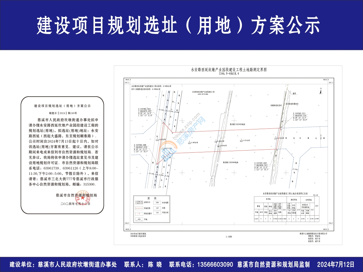 慈溪市人民政府坎墩街道办事处拟申请办理永安路西延坎墩产业园段建设工程的规划选址(用地),拟选址(用地)地址:永安路西延(西起大盛路,东至规划顺泰路)。公示时间自2024年7月13日起十日内,如对该选址(用地)方案有意见、建议,请在公示期间来电或来信到市自然资源和规划局。若无异议,我局将依申请办理选址意见书及建设用地规划许可证。市自然资源和规划局联系电话:63961739、63961126(上午8:00-11:30,下午2:00-5:00,节假日除外),来信请寄:慈溪市三北大街777号慈溪市行政服务中心自然资源和规划局,邮编:315300。