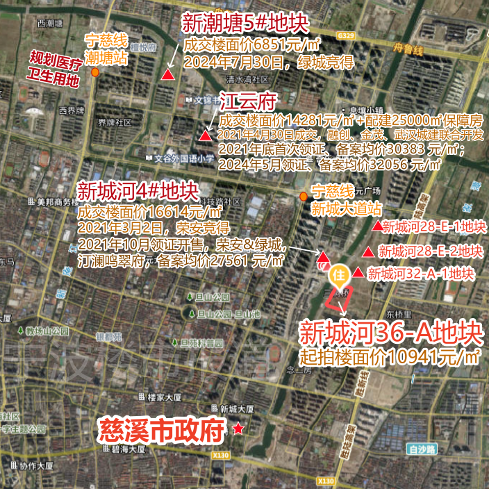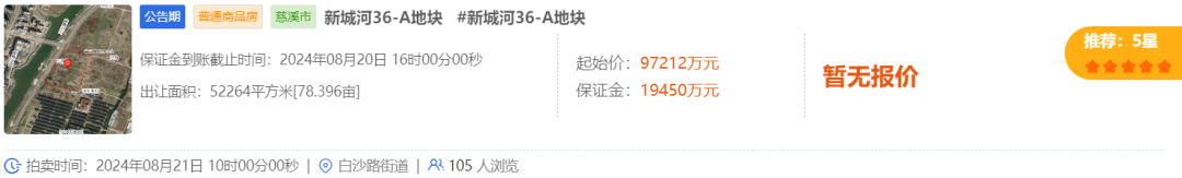 上图中,与今天挂出的新城河36-A地块隔河相望的新城河4#地块,就是迄今为止慈溪成交单价最高的宅地“地王”,于2021年3月2日被荣安以楼面价16614元/平方米摘取,溢价率40.8%。