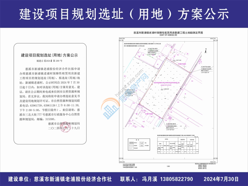 慈溪市新浦镇老浦股份经济合作社拟申请办理慈溪市新浦镇老浦村保障性租赁用房新建工程项目的规划选址(用地),拟选址(用地)地址:新浦镇老浦村。公示时间自2024年7月30日起十日内,如对该选址(用地)方案有意见、建议,请在公示期间来电或来信到市自然资源和规划局。若无异议,我局将依申请办理选址意见书及建设用地规划许可证。市自然资源和规划局联系电话:63961739、63961126(上午8:00-11:30,下午2:00-5:00,节假日除外),来信请寄:慈溪市三北大街777号慈溪市行政服务中心自然资源和规划局,邮编:315300。