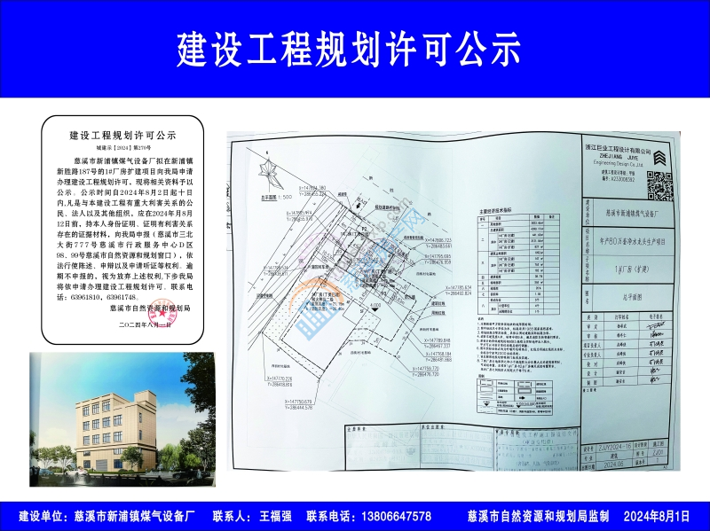 慈溪市新浦镇煤气设备厂拟在新浦镇新胜路187号的1#厂房扩建项目向我局申请办理建设工程规划许可,现将相关资料予以公示。公示时间自2024年8月2日起十日内,凡是与本建设工程有重大利害关系的公民、法人以及其他组织,应在2024年月8月12日前,持本人身份证明、证明有利害关系存在的证据材料,向我局申报(慈溪市三北大街777号慈溪市行政服务中心D区98、99号慈溪市自然资源和规划窗口),依法行使陈述、申辩以及申请听证等权利。逾期不申报的,视为放弃上述权利,下步我局将依申请办理建设工程规划许可。联系电话:63961810,63961748。
