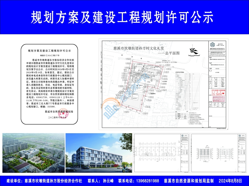 慈溪市坎墩街道孙方股份经济合作社拟申请办理慈溪市坎墩街道孙方村文化礼堂项目的规划设计方案及建设工程规划许可,现将规划方案予以公示。公示时间自2024年8月9日至2024年8月18日,如有意见、建议,请在公示期间来电或来信到市行政服务中心规划窗口。涉及重大利害关系的,利害关系人如需申请听证,请在公示结束前向我局提出申请,听证申请人须提供姓名、住址、电话号码、身份证号码、签名及证明利害关系等事项的书面材料。若无异议,我局将依申请办理规划设计方案及建设工程规划许可证。市自然资源和规划局联系电话:63961739、63961126(上午8:00-11:30,下午2:00-5:00,节假日除外),来信请寄:慈溪市三北大街777号慈溪市行政服务中心规划窗口,邮编:315300。