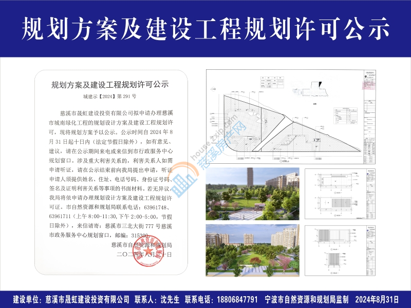 慈溪市晟虹建设投资有限公司拟申请办理慈溪市城南绿化工程的规划设计方案及建设工程规划许可,现将规划方案予以公示。公示时间自2024年8月31日起十日内(法定节假日除外),如有意见、建议,请在公示期间来电或来信到市行政服务中心规划窗口。涉及重大利害关系的,利害关系人如需申请听证,请在公示结束前向我局提出申请,听证申请人须提供姓名、住址、电话号码、身份证号码、签名及证明利害关系等事项的书面材料。若无异议,我局将依申请办理规划设计方案及建设工程规划许可证。市自然资源和规划局联系电话:63961748、 63961711(上午8:00-11:30,下午2:00-5:00,节假日除外),来信请寄:慈溪市三北大街777号慈溪市政务服务中心规划窗口,邮编:315300。