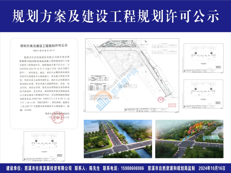 慈溪市住房发展投资有限公司拟申请办理新潮塘6#地块配套基础设施工程的规划设计方案及建设工程规划许可,现将规划方案予以公示。公示时间自2024年10月17日起十日内(法定节假日除外),如有意见、建议,请在公示期间来电或来信到市行政服务中心规划窗口。涉及重大利害关系的,利害关系人如需申请听证,请在公示结束前向我局提出申请,听证申请人须提供姓名、住址、电话号码、身份证号码、签名及证明利害关系等事项的书面材料。若无异议,我局将依申请办理规划设计方案及建设工程规划许可证。市自然资源和规划局联系电话:63961748、 63961711(上午8:00-11:30,下午1:30-4:30,节假日除外),来信请寄:慈溪市三北大街777号慈溪市政务服务中心规划窗口,邮编:315300。
