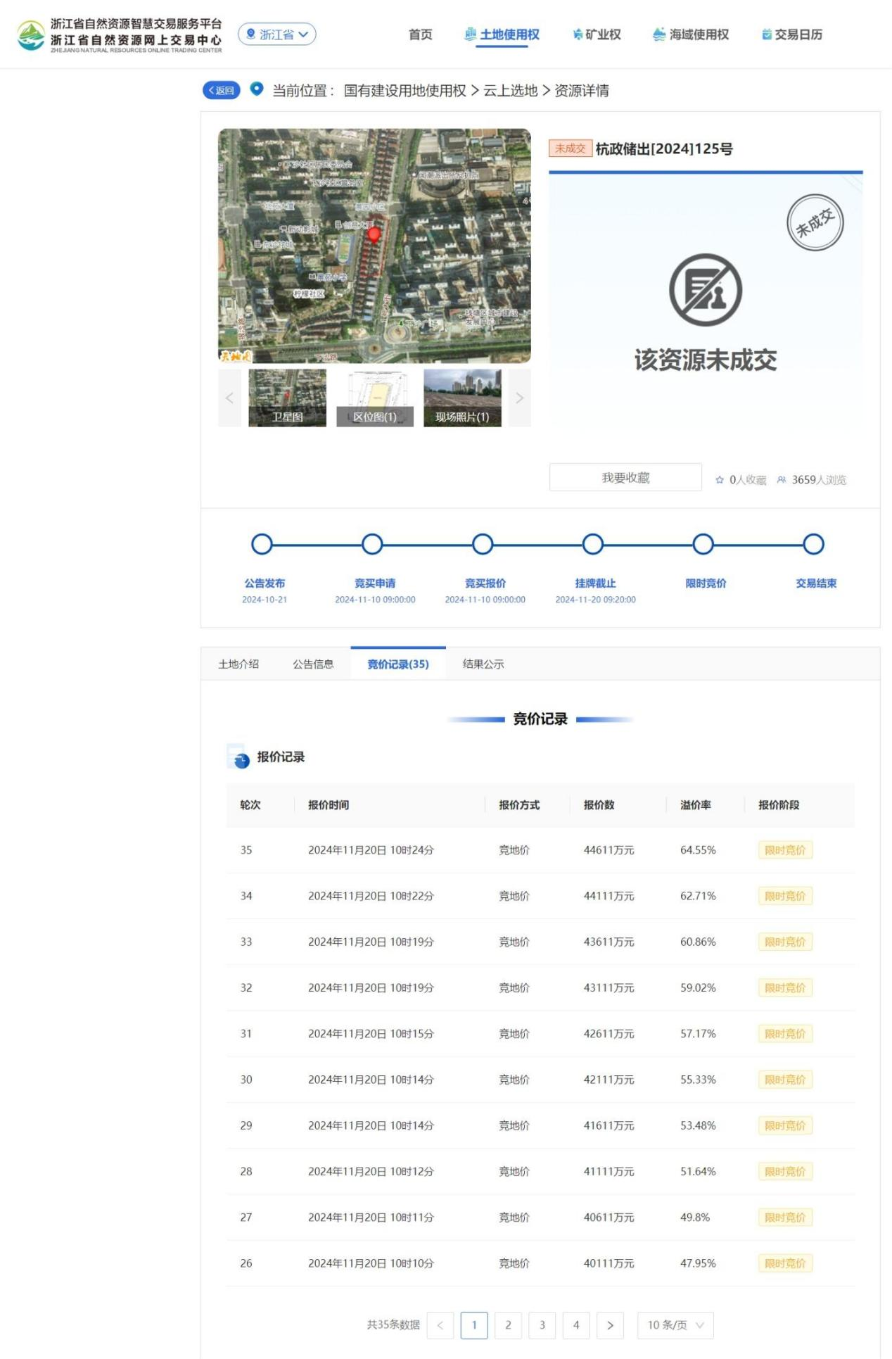 在浙江省自然资源网上交易中心/浙江省自然资源智慧交易服务平台上,曾历经35轮叫价、最终溢价64.55%以4.46亿元的最高价抢下的杭政储出【2024】125号地块,显示没有成交。