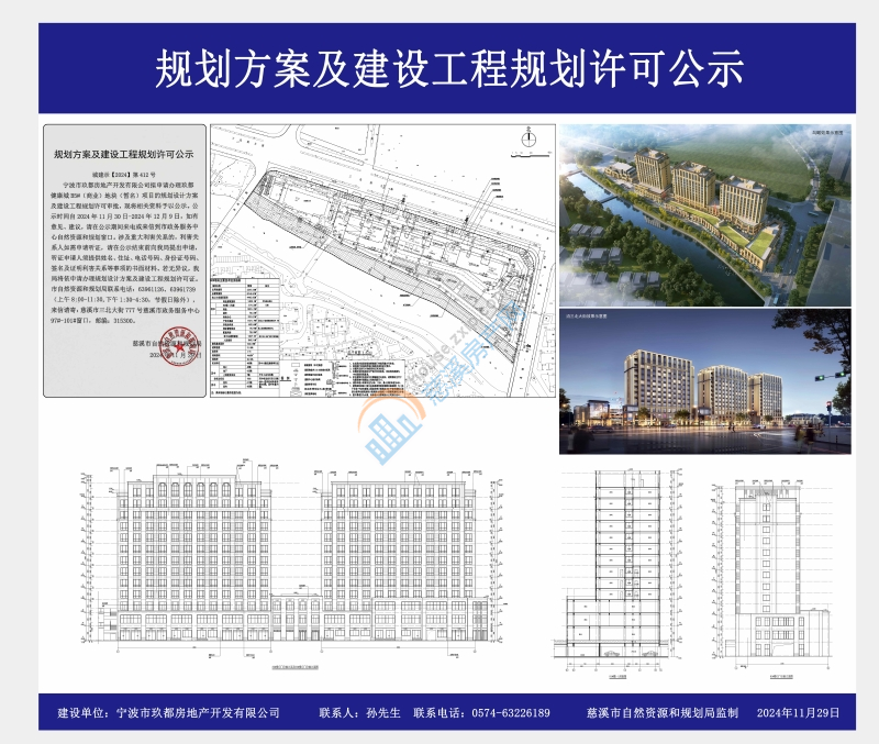 宁波市玖都房地产开发有限公司拟申请办理玖都健康城B5#(商业)地块(暂名)项目的规划设计方案及建设工程规划许可审批,现将相关资料予以公示。公示时间自2024年11月30日-2024年12月9日,如有意见、建议,请在公示期间来电或来信到市政务服务中心自然资源和规划窗口。涉及重大利害关系的,利害关系人如需申请听证,请在公示结束前向我局提出申请,听证申请人须提供姓名、住址、电话号码、身份证号码、签名及证明利害关系等事项的书面材料。若无异议,我局将依申请办理规划设计方案及建设工程规划许可证。市自然资源和规划局联系电话:63961126、63961739(上午8:00-11:30,下午1:30-4:30,节假日除外),来信请寄:慈溪市三北大街777号慈溪市政务服务中心97#-101#窗口,邮编:315300。