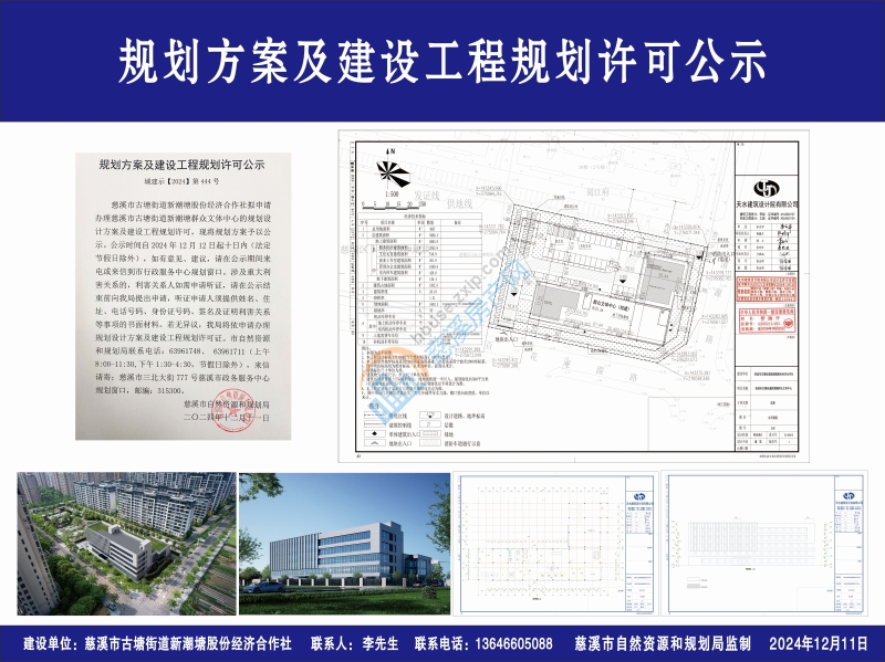 慈溪市古塘街道新潮塘股份经济合作社拟申请办理慈溪市古塘街道新潮塘群众文体中心的规划设计方案及建设工程规划许可,现将规划方案予以公示。公示时间自2024年12月12日起十日内(法定节假日除外),如有意见、建议,请在公示期间来电或来信到市行政服务中心规划窗口。涉及重大利害关系的,利害关系人如需申请听证,请在公示结束前向我局提出申请,听证申请人须提供姓名、住址、电话号码、身份证号码、签名及证明利害关系等事项的书面材料。若无异议,我局将依申请办理规划设计方案及建设工程规划许可证。市自然资源和规划局联系电话:63961748、 63961711(上午8:00-11:30,下午1:30-4:30,节假日除外),来信请寄:慈溪市三北大街777号慈溪市政务服务中心规划窗口,邮编:315300。