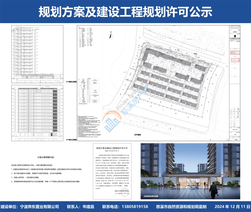 宁波奔东置业有限公司拟申请变更新城河59-B地块房地产开发项目(暂名)的规划设计方案及建设工程规划许可,现将规划方案予以公示。公示时间自2024年12月13日起十日内,如有意见、建议,请在公示期间来电或来信到市行政服务中心自然资源和规划窗口。涉及重大利害关系的,利害关系人如需申请听证,请在公示结束前向我局提出申请,听证申请人须提供姓名、住址、电话号码、身份证号码、签名及证明利害关系等事项的书面材料。若无异议,我局将依申请办理规划设计方案及建设工程规划许可证。市自然资源和规划局联系电话:63961126、63961739(上午8:00-11:30,下午1:30-4:30,节假日除外),来信请寄:慈溪市三北大街777号慈溪市行政服务中心97#-101#窗口,邮编:315300。