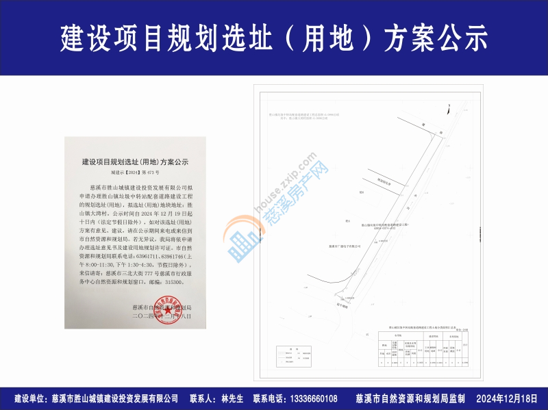 慈溪市胜山城镇建设投资发展有限公司拟申请办理胜山镇垃圾中转站配套道路建设工程的规划选址(用地),拟选址(用地)地块地址:胜山镇大湾村。公示时间自2024年12月19日起十日内(法定节假日除外),如对该选址(用地)方案有意见、建议,请在公示期间来电或来信到市自然资源和规划局。若无异议,我局将依申请办理选址意见书及建设用地规划许可证。市自然资源和规划局联系电话:63961711、63961746(上午8:00-11:30,下午1:30-4:30,节假日除外),来信请寄:慈溪市三北大街777号慈溪市行政服务中心自然资源和规划窗口,邮编:315300。