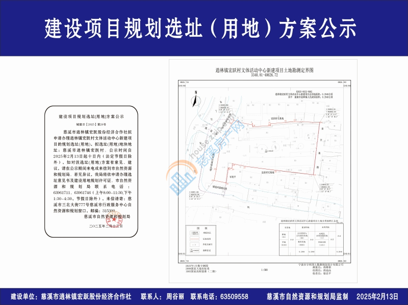 慈溪市逍林镇宏跃股份经济合作社拟申请办理逍林镇宏跃村文体活动中心新建项目的规划选址(用地),拟选址(用地)地块地址:慈溪市逍林镇宏跃村。公示时间自2025年2月13日起十日内(法定节假日除外),如对该选址(用地)方案有意见、建议,请在公示期间来电或来信到市自然资源和规划局。若无异议,我局将依申请办理选址意见书及建设用地规划许可证。市自然资源和规划局联系电话:63961711、63961746(上午8:00-11:30,下午1:30-4:30,节假日除外),来信请寄:慈溪市三北大街777号慈溪市行政服务中心自然资源和规划窗口,邮编:315300。