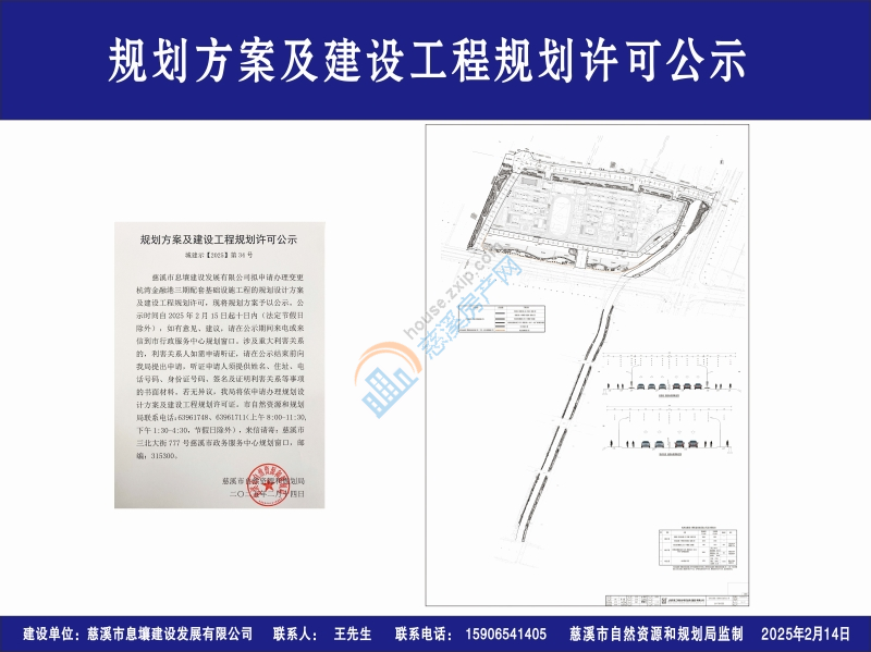 慈溪市息壤建设发展有限公司拟申请办理变更杭湾金融港三期配套基础设施工程的规划设计方案及建设工程规划许可,现将规划方案予以公示。公示时间自2025年2月15日起十日内(法定节假日除外),如有意见、建议,请在公示期间来电或来信到市行政服务中心规划窗口。涉及重大利害关系的,利害关系人如需申请听证,请在公示结束前向我局提出申请,听证申请人须提供姓名、住址、电话号码、身份证号码、签名及证明利害关系等事项的书面材料。若无异议,我局将依申请办理规划设计方案及建设工程规划许可证。市自然资源和规划局联系电话:63961748、 63961711(上午8:00-11:30,下午1:30-4:30,节假日除外),来信请寄:慈溪市三北大街777号慈溪市政务服务中心规划窗口,邮编:315300。