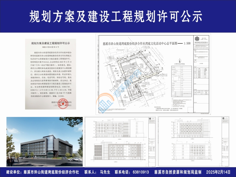 慈溪市浒山街道湾底股份经济合作社拟申请办理变更慈溪市浒山街道湾底股份经济合作社湾底文化活动中心的规划设计方案及建设工程规划许可,现将规划方案予以公示。公示时间自2025年2月15日起十日内(法定节假日除外),如有意见、建议,请在公示期间来电或来信到市行政服务中心规划窗口。涉及重大利害关系的,利害关系人如需申请听证,请在公示结束前向我局提出申请,听证申请人须提供姓名、住址、电话号码、身份证号码、签名及证明利害关系等事项的书面材料。若无异议,我局将依申请办理规划设计方案及建设工程规划许可证。市自然资源和规划局联系电话:63961748、 63961711(上午8:00-11:30,下午1:30-4:30,节假日除外),来信请寄:慈溪市三北大街777号慈溪市政务服务中心规划窗口,邮编:315300。