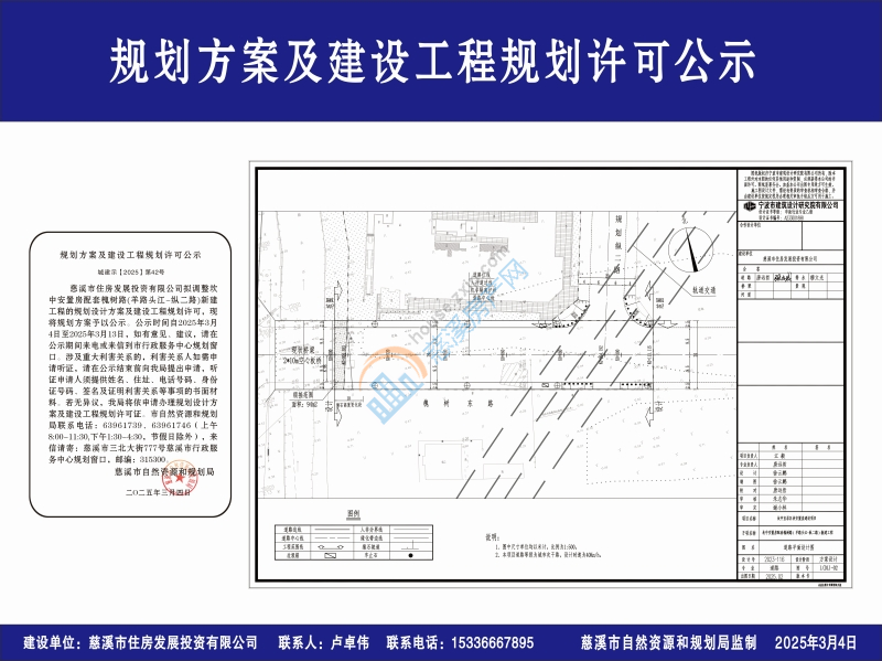 慈溪市住房发展投资有限公司拟调整坎中安置房配套槐树路(羊路头江-纵二路)新建工程的规划设计方案及建设工程规划许可,现将规划方案予以公示。公示时间自2025年3月4日至2025年3月13日,如有意见、建议,请在公示期间来电或来信到市行政服务中心规划窗口。涉及重大利害关系的,利害关系人如需申请听证,请在公示结束前向我局提出申请,听证申请人须提供姓名、住址、电话号码、身份证号码、签名及证明利害关系等事项的书面材料。若无异议,我局将依申请办理规划设计方案及建设工程规划许可证。市自然资源和规划局联系电话:63961739、63961746(上午8:00-11:30,下午1:30-4:30,节假日除外),来信请寄:慈溪市三北大街777号慈溪市行政服务中心规划窗口,邮编:315300。