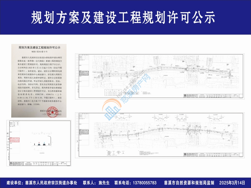 慈溪市人民政府宗汉街道办事处拟申请办理历新路北延(新界路—宗天路段)新建工程的规划方案及建设工程规划许可,现将规划方案予以公示。公示时间自2025年3月15日起十日内(法定节假日除外),如有意见、建议,请在公示期间来电或来信到市行政服务中心规划窗口。涉及重大利害关系的,利害关系人如需申请听证,请在公示结束前向我局提出申请,听证申请人须提供姓名、住址、电话号码、身份证号码、签名及证明利害关系等事项的书面材料。若无异议,我局将依申请办理规划设计方案及建设工程规划许可证。市自然资源和规划局联系电话:63961748、63961711(上午8:00-11:30,下午1:30-4:30,节假日除外),来信请寄:慈溪市三北大街777号慈溪市政务服务中心规划窗口,邮编:315300。