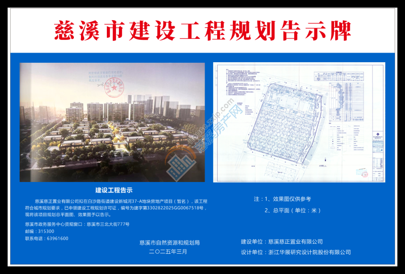 慈溪慈正置业有限公司拟在白沙路街道建设新城河37-A地块房地产项目(暂名)项目,该工程符合城市规划要求,已申领建设工程规划许可证,编号为建字第3302822025GG0067518号,现将该项目规划总平面图、效果图予以告示。